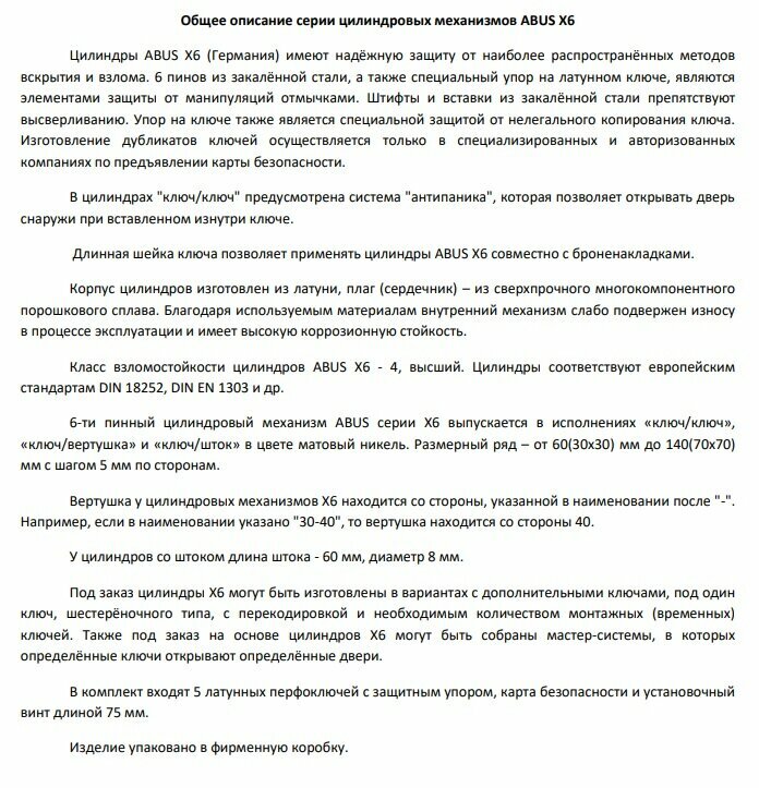 Механизм цилиндровый ABUS X6410 в исполнении ключ/ключ, 6-ти пинный, материал корпуса - латунь, плаг изготовлен из многокомпонентного порошкового сплава, пять перфорированыых ключей с длинной шейкой позволяет использовать цилиндр с любыми видами броненакладок. Цвет - матовый никель. Имеется защита от наиболее распространённых методов вскрытия - от манипуляций отмычками, высверливания и бампинга. Система "антипаника", позволяет открывать дверь снаружи при вставленном изнутри ключе. Производство Германия.
