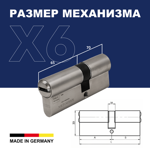 Механизм цилиндровый ABUS X6410 в исполнении ключ/ключ, 6-ти пинный, материал корпуса - латунь, плаг изготовлен из многокомпонентного порошкового сплава, пять перфорированыых ключей с длинной шейкой позволяет использовать цилиндр с любыми видами броненакладок. Цвет - матовый никель. Имеется защита от наиболее распространённых методов вскрытия - от манипуляций отмычками, высверливания и бампинга. Система "антипаника", позволяет открывать дверь снаружи при вставленном изнутри ключе. Производство Германия.