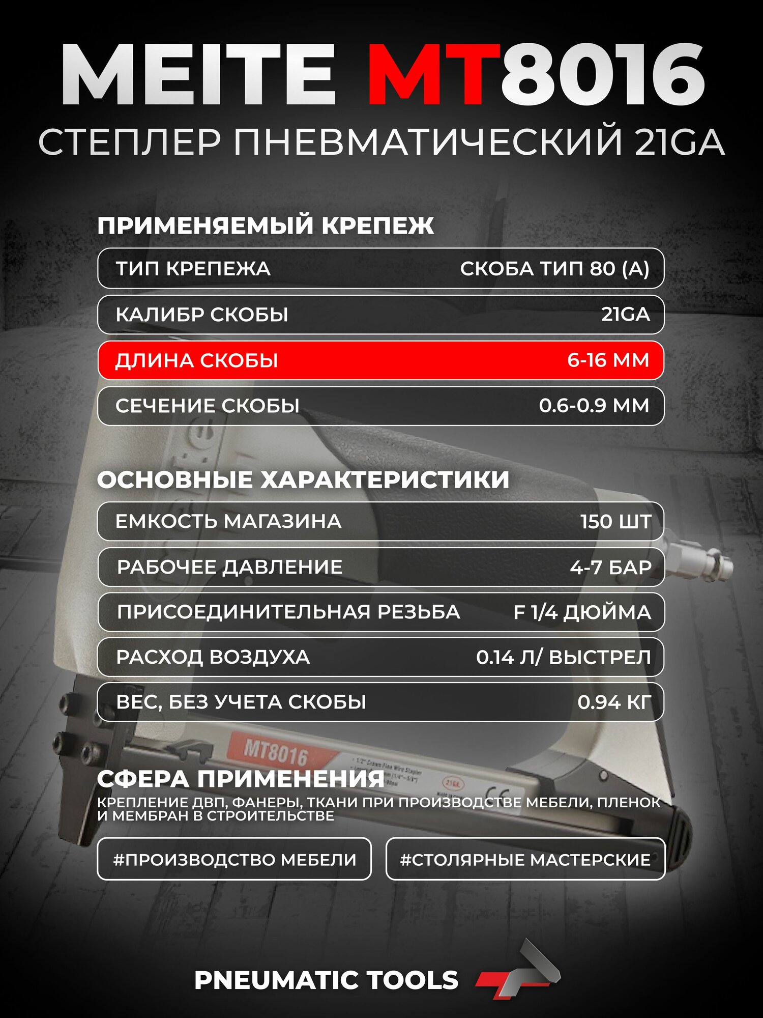 Купить Пневмостеплер обивочный для скобы 21GA, тип 80 (А), MT8016 MEITE с доставкой по всей России. Пневмостеплер обивочный для скобы 21GA, тип 80 (А), MT8016 MEITE: сравнение цен, характеристики, фото, актуальное наличие и цены.