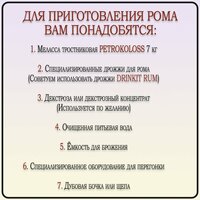 Ром из мелассы. При использовании только экстракта мелассы, выход продукта будет очень маленький, однако аромат наиболее насыщенный. Рекомендуем использовать 1-2 кг декстрозы или декстрозного концентрата на каждые 4 кг мелассы при постановке на брожение. Можно делать и на сахаре, в данном случае может присутствовать более резкие запахи, чем с работой на декстрозе. Ставим брагу из расчета на каждый 1 кг мелассы 4 литра воды. Дрожжи рекомендуем использовать специализированные, для рома ( Drinkit RUM).