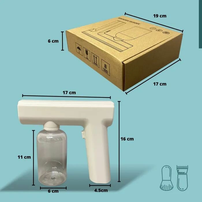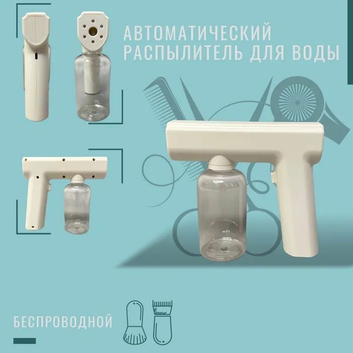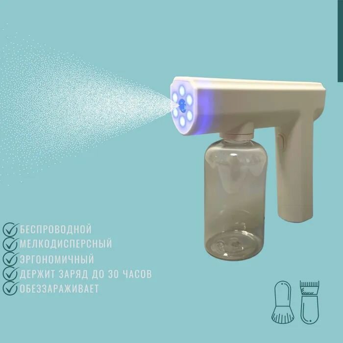 Распылитель оснащен ульфиолетовыми диодами, который обеззараживает водяное облако. Эргономическая форма, легкий вес и маленький расход воды позволяет работать в течение долгого времени. Аккумулятор держит заряд до 30 минут. Безшумная работа распылителя не потревожит клиента в особенно детей.