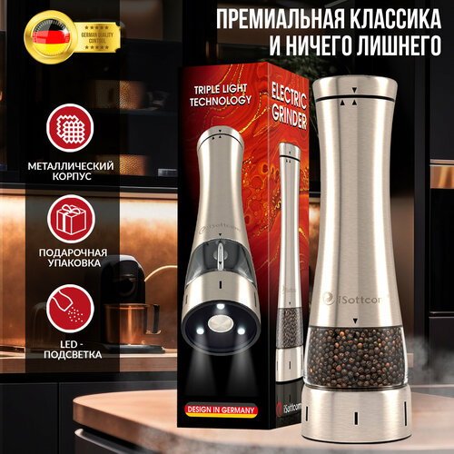 Мельница электрическая для соли, перца и других специй и приправ iSottcom с подсветкой и регулировкой степени помола Премиальный измельчитель для гималайской соли, перца и других специй и приправ с тройной светодиодной подсветкой и регулируемой степенью помола разработан в Германии и выполнен из высококачественных материалов. Сертифицирован в Германии и Таможенном союзе. Наша электромельница заменит Вам традиционные солонки и перечницы, станет прекрасным дополнением к интерьеру Вашей кухни. Вас всегда будут радовать вкус свежемолотых специй, которые в отличие от заранее фасованных приправ, сохраняют присущие им аромат и пользу. Строгий и лаконичный дизайн наших мельниц украсит любой стол. Регулировка степени помола делает их использование еще более удобным. Большая емкость для специй не требуют частого заполнения. Тройная светодиодная подсветка перцемолок будет актуальной в случае романтического ужина с приглушенным освещением. Необычный и стильный подарок для друзей и семьи, который, мы уверены, произведёт должный WOW-эффект и никого не оставит равнодушным. Ключевые особенности продукта: мощная, эргономичная и тихая электромельница идеально ложиться в руку управляется нажатием одной кнопки мягкий ход кнопки (нет скрипов, западаний) объемная емкость для специй и отверстие большого диаметра для удобного заполнения тройная светодиодная подсветка удобная регулировка степени помола строгий минималистичный дизайн подойдет как для hi-tech, так и для классических интерьеров высококачественная пищевая сталь качественный керамический нож - бережный помол элементы питания 6 ААА для каждой мельницы (в комплект не входят) премиальная яркая подарочная упаковка из плотного высококачественного картона .
