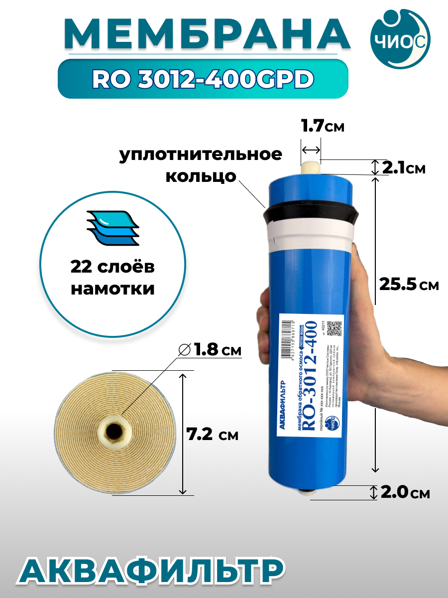 Мембрана обратного осмоса Аквафильтр RO 3012-400GPD является главным элементом обратноосмотической системы. Она обеспечивает ультраглубокую очистку воды от всех видов загрязнений: органических включений, микроорганизмов, растворенных химических примесей, солей жесткости и тяжелых металлов, радионуклидов и других.