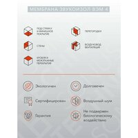 Тонкая эластичная звукоизоляционная мембрана с высокой массой (толщина 4мм). Применяется в звукоизоляционных конструкциях в сочетании с гипсокартоном (ГКЛ, ГВЛ, Фанера и пр). Снижает воздушный шум в слышимых диапазонах частот, так же снижает вибрацию. Улучшает шумоизоляцию при минимальной толщине системы. Производится в России на основе полимерной композиции природным минеральным наполнителем. Содержит природные минералы для увеличения массы и поверхностной плотности. Подходит для использования в жилых и нежилых помещениях.