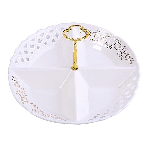 Менажница фарфоровая LORAINE, сочетает в себе изысканный дизайн с максимальной функциональностью. Блюдо по краям оформлено элегантным декором с золотистой каймой и ажурными элементами. Менажница имеет 4 секции, а также удобную металлическую ручку. Такое сервировочное блюдо предназначено для красивой подачи конфет, фруктов и десертов, а также можно использовать для сервировки оливок, сыра, закусок. Менажница украсит сервировку вашего стола и подчеркнет прекрасный вкус хозяйки. Менажницы являются отличным вариантом подарка для любой женщины: мамы, бабушки, подруги. Этот функциональный предмет посуды прост в обращении, легко моется, не занимает много места. Менажница LR ; Материал: фарфор; Цвет: белый, золототой; Секций: 4 шт; Высота тарелки: 4 см, с ручкой - 16 см; Диаметр: 26,5 см; Размер секций: 12,5 х 12,5 х 19 см; Объек секции: 300 мл; Размер упаковки: 27,8 х 27,5 х 5,3 см; Упаковка: коробка; Вес: 1,04 кг; Страна производитель: Китай.