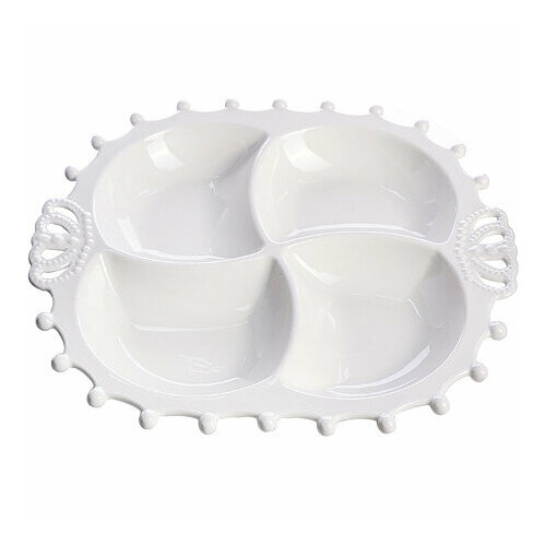Менажница фарфоровая LORAINE, сочетает в себе изысканный дизайн с максимальной функциональностью. Тарелка имеет сложную изящную форму и рельефный узор в виде короны. Менажница имеет 4 небольших отделения одинакового размера. Такое сервировочное блюдо предназначено для красивой подачи конфет, варенья, джемов и десертов, а также можно использовать для сервировки оливок, сыра, соусов и мелких закусок. Менажница украсит сервировку вашего стола и подчеркнет прекрасный вкус хозяйки. Блюдо для сервировки является отличным вариантом подарка для любой женщины: мамы, бабушки, подруги. Этот функциональный предмет посуды прост в обращении, легко моется, не занимает много места. Менажница LR ; Материал: фарфор; Цвет: белый; Секций: 4 шт; Размер блюда: 27 х 25 см; Высота борта: 3,5 см; Объем секций: 150 мл х 4; Размер секций: 12 х 9,5 см; Размер упаковки: 27,9 х 26 х 4,5 см; Упаковка: коробка; Вес: 975 г; Страна производитель: Китай.