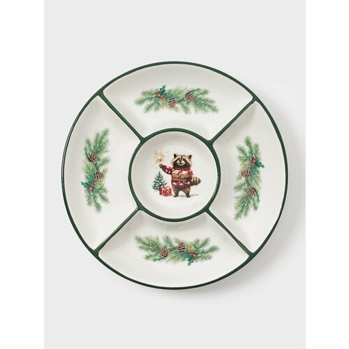 Круглая форма с пятью секциями позволяет удобно разместить различные закуски, создавая визуально привлекательную подачу. Рисунок на новогоднюю тематику добавляет дополнительное праздничное настроение и делает менажницу ярким акцентом в декоре вашей кухни.