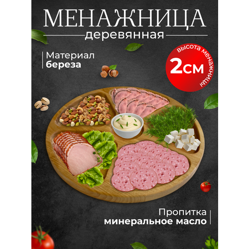 Менажница круглая из березы от Столярной Мастерской Привалова - это изысканный аксессуар для сервировки стола. Изготовленная из высококачественной березы, она пропитана минеральным маслом, что делает ее устойчивой к влаге и продлевает срок службы.
