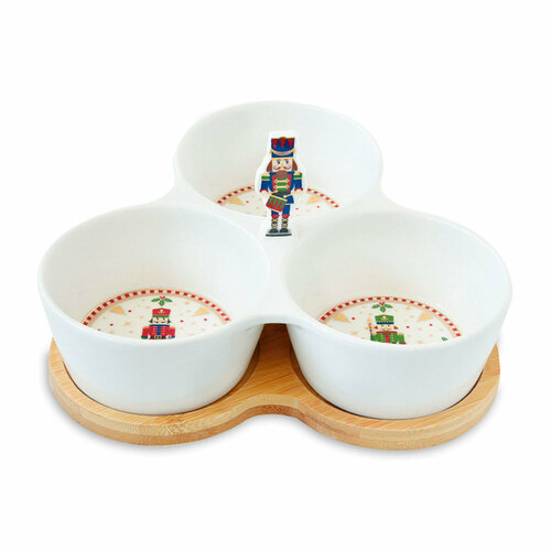 Менажница декорирована изображением Щелкунчика, что делает ее не только практичной, но и стильной деталью сервировки стола.