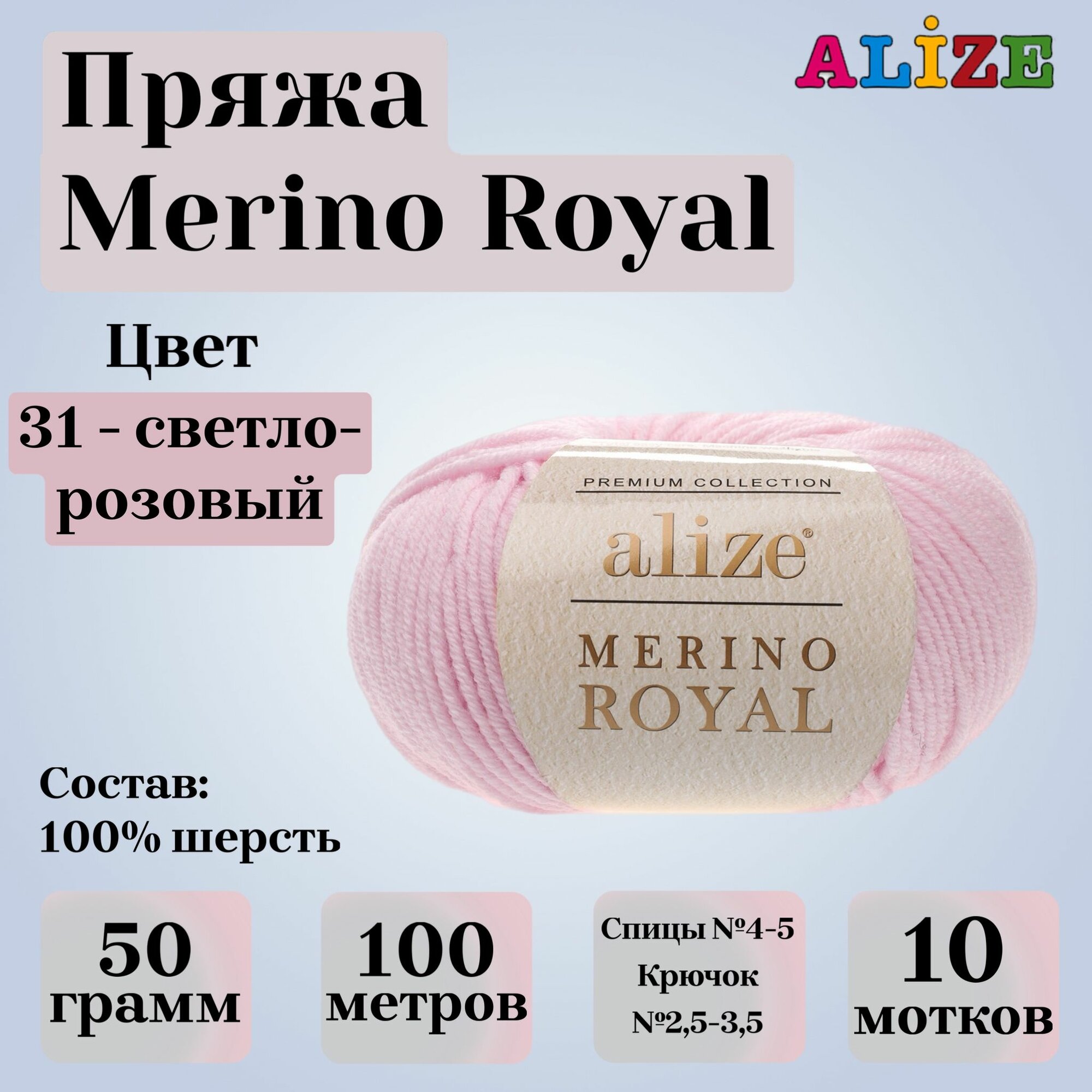 Мериносовая пряжа для вязания Alize Merino Royal, цвет 31 светло-розовый, моток 50г, 100м, 10 мотков/упак: сравнение цен, характеристики, фото, актуальное наличие и цены.