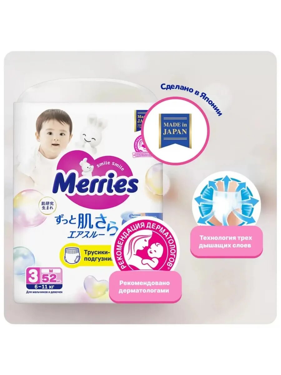 Купить Merries Подгузники-трусики M (6-11 кг) 52 шт. с доставкой по всей России. Merries Подгузники-трусики M (6-11 кг) 52 шт.: сравнение цен, характеристики, фото, актуальное наличие и цены.