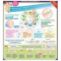 антисептические добавки, эластичные резинки вокруг ножек, многоразовые застежки-липучки, эластичный пояс, боковые внутренние бортики, индикатор наполнения, рельефная внутренняя поверхность, эко-подгузники, большая упаковка