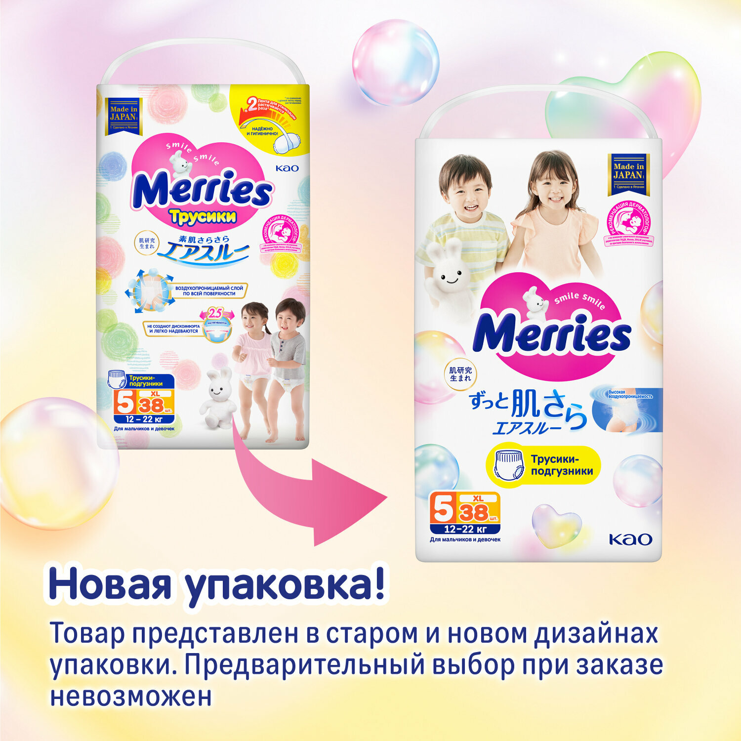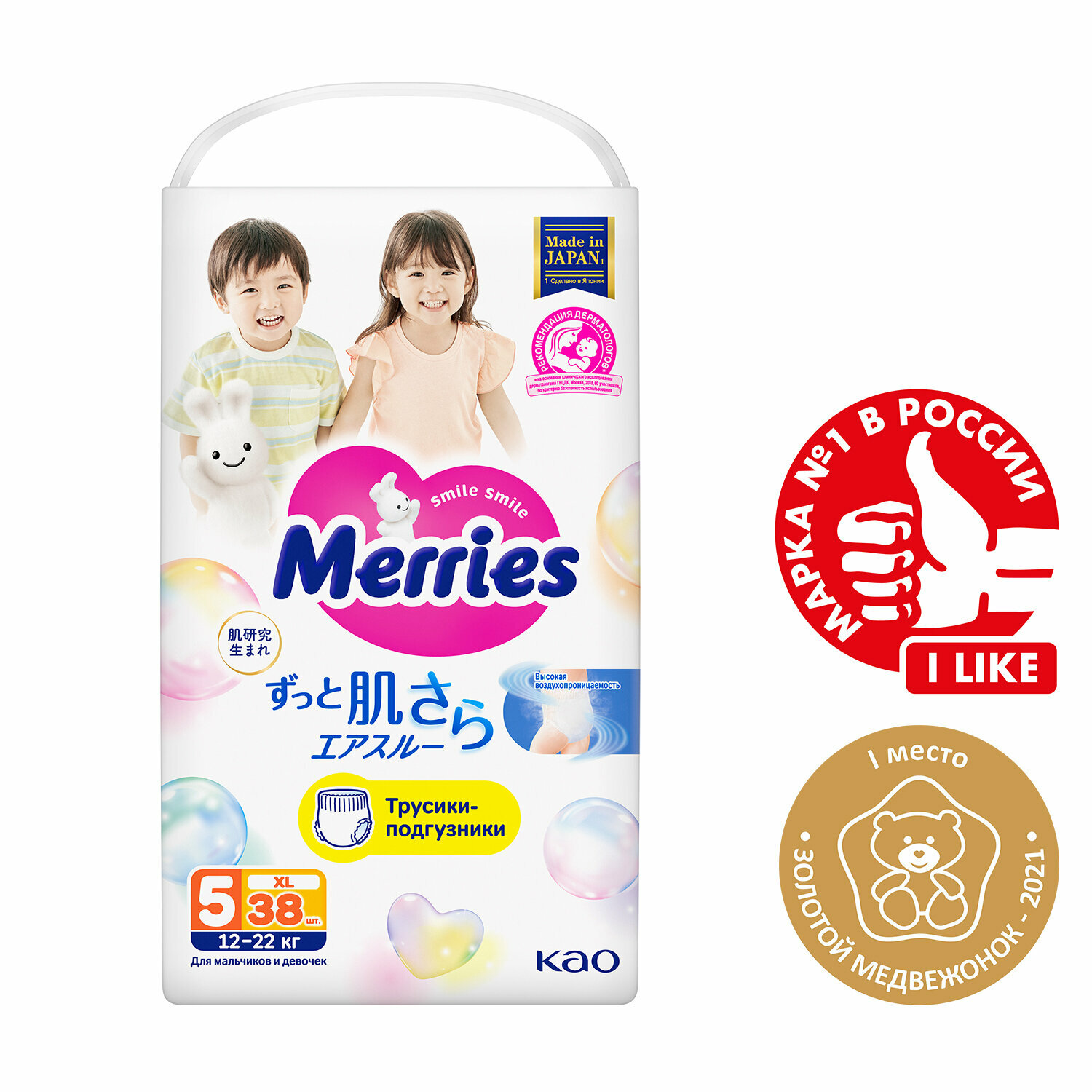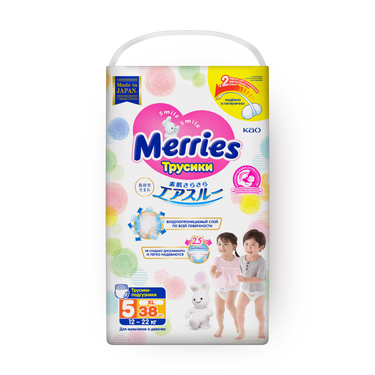 Трусики-подгузники Merries для детей обеспечивают комфорт и защиту. Они предназначены для малышей весом от 12 до 22 кг и имеют размер XL / 5. В упаковке содержится 38 штук. Эти подгузники отличаются дышащими материалами и гипоаллергенностью.