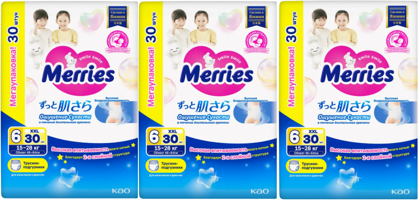 | Комплектация | Merries трусики XXL (15-28 кг), 26 шт., белый |