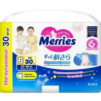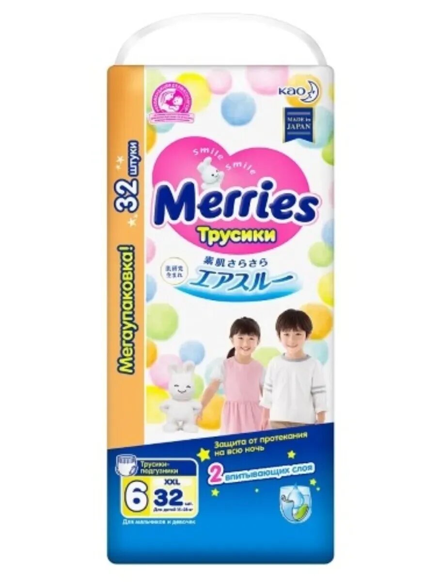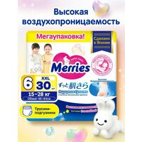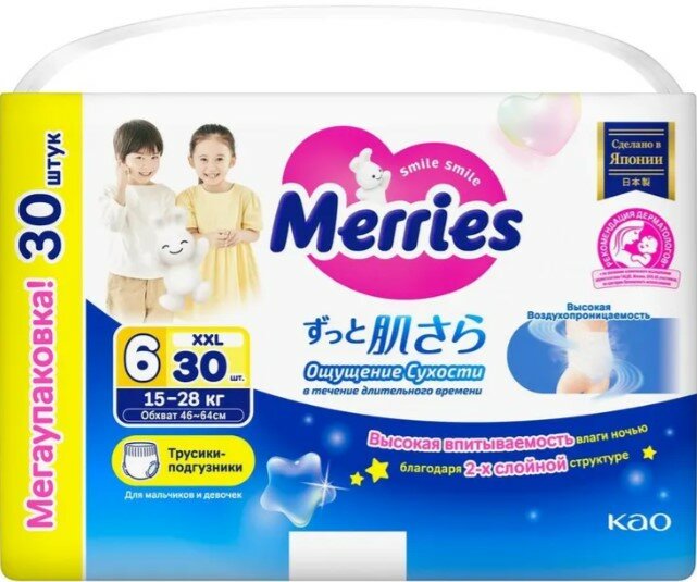 Детские одноразовые японские трусики-подгузники Merries (Меррис) для малышей с весом от 15 до 28 кг (размер XXL, 6, ночные) созданы с особенной заботой о коже и комфорте Вашего ребёнка. Идеально подойдут малышу, который активно двигается, бегает и исследует мир вокруг. Merries – победитель премии «Марка №1 в России» в 2022 г. в категории «Подгузники и трусики для детей» и лучший бренд для малышей по признанию мам. Анатомический крой трусиков Меррис, учитывающий все особенности растущего малыша, обеспечивает комфорт и свободу движений ребёнка. Трусики легко снимать, надевать и удобно носить. Они хорошо сидят на талии, не сползают, не жмут и не оставляют следов на нежной коже малыша. Трусики Merries хорошо подходят как дневные подгузники, когда ребёнок максимально подвижен, так и в качестве ночных подгузников, когда малыш дольше не переодевается. Двойной впитывающий слой по всей поверхности трусиков предотвращает протекание, когда ребёнок долго лежит на спине. А оборочки нежно облегают ножки и не образуют щелей, даже если ребёнок много ворочается ночью. Гипоаллергенные материалы не вызывают раздражений, опрелостей и дискомфорта. Полимерный абсорбент отлично впитывает большое количество жидкости, превращает её в гель и защищает от протеканий даже при значительном надавливании. Гладкая, шелковистая поверхность из тончайших волокон максимально сокращает трение при движении малыша. Обновлённая технология трёх воздухопроницаемых слоёв сохраняет кожу малыша сухой и здоровой, обеспечивая свободное выведение прелого воздуха из подгузника. Внутренняя поверхность трусиков остаётся удивительно мягкой для кожи ребёнка и не прилипает к попке даже после того, как впитает большой объём жидкости. Трёхполосный индикатор наполнения легко проверить, не раздевая полностью малыша. Если полоски сменили цвет, трусики пора заменить на новые. Мягкий эластичный поясок не давит на животик и растягивается в 2,5 раза, что позволяет легко сменить трусики, когда малыш лежит. Ультразвуковой метод соединения боковых швов делает шов более мягким. Теперь при смене подгузника он разрывается ещё легче, а при ношении трусиков не ощутим для малыша, не натирает и не оставляет следов на коже. Эластичная лента для утилизации растягивается в 2 раза и надёжно фиксирует даже переполненный подгузник. Более широкий впитывающий слой по всей области между ножек не позволяет жидкости скапливается в одном месте, поэтому трусики не сбиваются в комок, не провисают и не создают дискомфорта, даже когда они уже наполнены. Трусики Merries подходят для девочек и для мальчиков. Не требуют использования защитных кремов и присыпок.