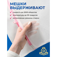 Большой набор имеет 5 чехлов разной формы: 50х60 см, 40х50 см, 30х40 см, цилиндрическую сетку 22х33 см и мешок для бюстгальтера 14х18 см. Чехол для бюстгальтера сохраняет форму белья, за счет жестких вставок. Каждая сетка застегивается на молнию, замок прячется под тканевой лентой. Благодаря такому способу защиты замка барабан стиральной машины останется целым и не подвергнется поломке.