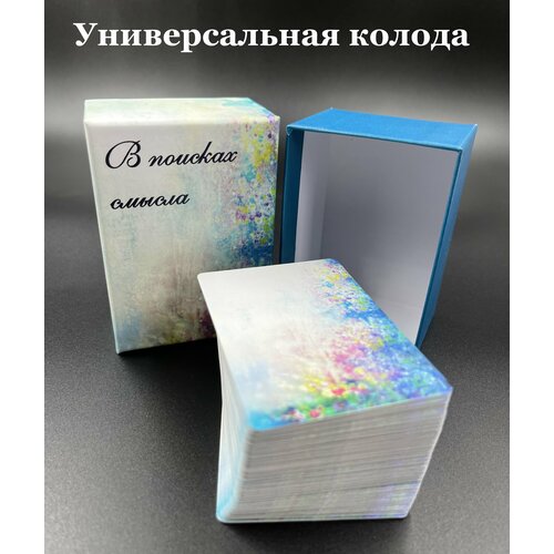 "В поисках смысла" универсальная колода, как и колода "Ох", она может применяться для работы с любым запросом. Эта колода помогает поразмыcлить на важные, вечные темы: о смысле человеческого существования и лично о вашей жизни, что же вам на самом деле важно и чем наполнена ваша жизнь, что является второстепенным и на что в повседневной жизни нужно меньше обращать внимания и возможно, остро реагировать. Какие-то аспекты жизни могут осветить вашу жизнь светом, а какие-то, наоборот, отвлечь, отвести с истинного пути. В колоде можно найти отражение различных сфер жизни, ценностей и особенностей мировосприятия и ощущения человека. В колоде есть карты и с негативным оттенком, которые деликатно приоткрывают важные темы и позволяют понять точки напряжения. Колода "В поисках смысла" глубокая: каждая карта - это отражение мира глубинных переживаний и представлений человека - какой я в этом мире, что значат для меня происходящие в моей жизни ситуации и и где мое место и предназначение. И в то же время мягкая колода: каждая карта - метафора семьи и родного дома, найденной свободы, вашей любви, этапов жизни, творчества, поиска смыслов, важных для каждого. У колоды приятная нежная рубашка в бело-голубых успокаивающих тонах. Метафорические карты «В поисках смысла» это набор из 124 изображений формата 88 на 60 мм. С колодой не идёт никаких инструкций.
