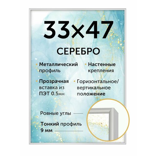 Алюминиевая рамка 33х47 см. Размеры фоторамки 33х47 указаны по размеру помещаемого вложения, а габаритные размеры рамки чуть больше: 334х474 мм (подробный слайд со всеми замерами находится в фотографиях). Рамки 47х33 подходят для постеров, фотографий, пазлов, алмазных мозаик и т. д. Вы можете вставить любое вложение, толщина которого не больше 5 мм. Рамка для постера 33х47 изготовлена из алюминиевого профиля, который обеспечивает прочность, коррозионную стойкость и долгий срок службы. В алюминиевой рамке 33 на 47 используется прозрачный пластик ПЭТ, а не стекло. ПЭТ невозможно разбить, он безопасный, не искажает изображение и обеспечивает 47% прозрачность. Внимание! Снимите защитную пленку с 2 сторон со вставки из ПЭТ! Для жесткой фиксации изображения рама 33х47 комплектуется прижимными пружинами. Они очень плотно держат вставку, что позволяет использовать рамки 33 на 47 для пазлов, алмазных мозаик и т. д. Фоторамка 33х47 очень надежно упакована. Риски повреждения при транспортировке сведены к минимуму. Чтобы вставить вложение в раму для картины 33х47, необходимо открутить 2 винта. К каждой рамке 33 на 47 прилагается инструкция по использованию, а более подробная инструкция выложена в фотографиях товара. Итак, рамки 33х47 см очень надежные и крепкие, несмотря на небольшой вес и тонкий изящный алюминиевый профиль. Рамка для фото 33х47 стильная, универсальная, отлично смотрится и в домашних, и в офисных интерьерах. Рамки 33 на 47 не подвержены коррозии; не боятся влаги и прямого солнечного света. Рамки 47х33 не подвержены деформации и устойчивы к механическим повреждениям, прослужат долго. Несомненное преимущество рамки 33х47 для картины – безопасная прозрачная вставка из ПЭТ. Рамку 33х47 можно красиво компоновать с другими размерами.