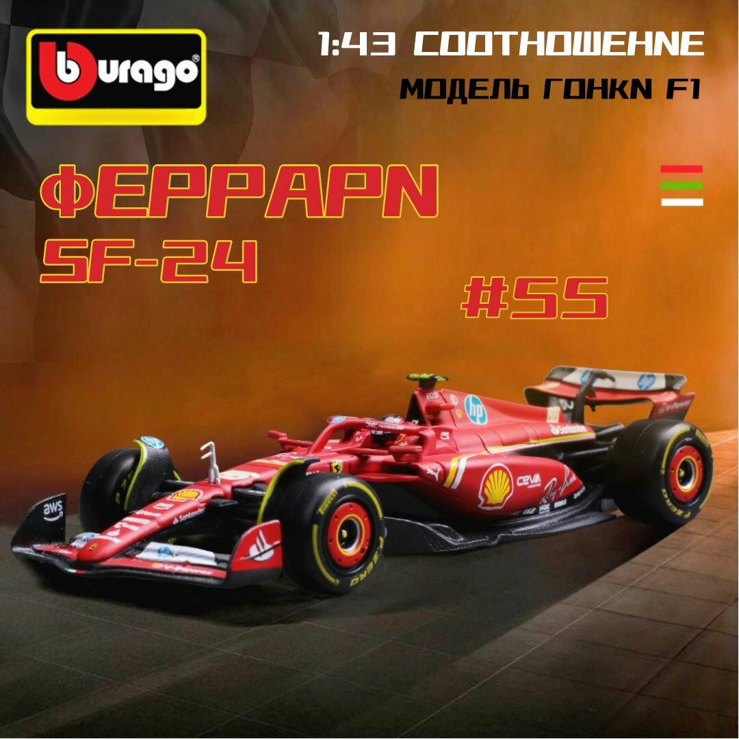 Металлическая коллекционная модель «Bburago» болида «Феррари» Карлос Сайнс (Carlos Sains/ Ferrari SF-24 №55) Формула-1, сезон 2024. Масштаб 1:43: сравнение цен, характеристики, фото, актуальное наличие и цены.