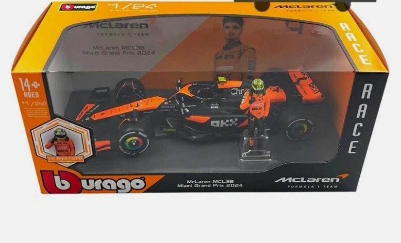 Великолепно детализированная металлическая модель гоночного болида Ландо Норриса из команды "Макларен"! Масштаб машинки 1:24, длина - 24 см. Также в комплекте идет детализированная стационарная фигурка самого гонщика данного болида. Это версия модели "McLaren" MCL38 Ландо Норриса в Гран-При Майами сезона 2024 Формулы-1. Такая модель просто обязана быть на полке у каждого фаната Формулы-1 и коллекционера этой серии!