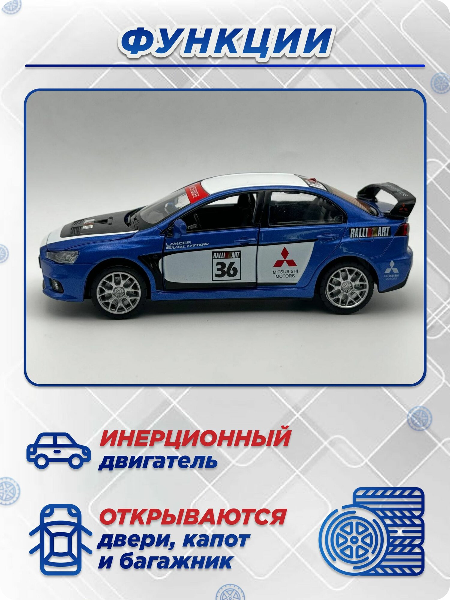 Металлическая машинка Mitsubishi Lancer evolution X 1:32 Синий /Чёрный /Белый, коллекционная модель Митсубиши Лансер Эволюшн 10 имеет инерционный двигатель, свет + звук: сравнение цен, характеристики, фото, актуальное наличие и цены.
