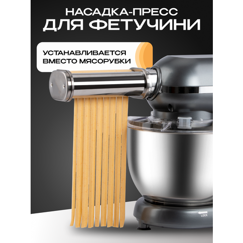 Насадка изготовлена из металла, что обеспечивает фиксацию и точность нарезки. В результате тесто проходит через пресс и получаются идеально ровные полоски фетучини шириной 6.5 мм.