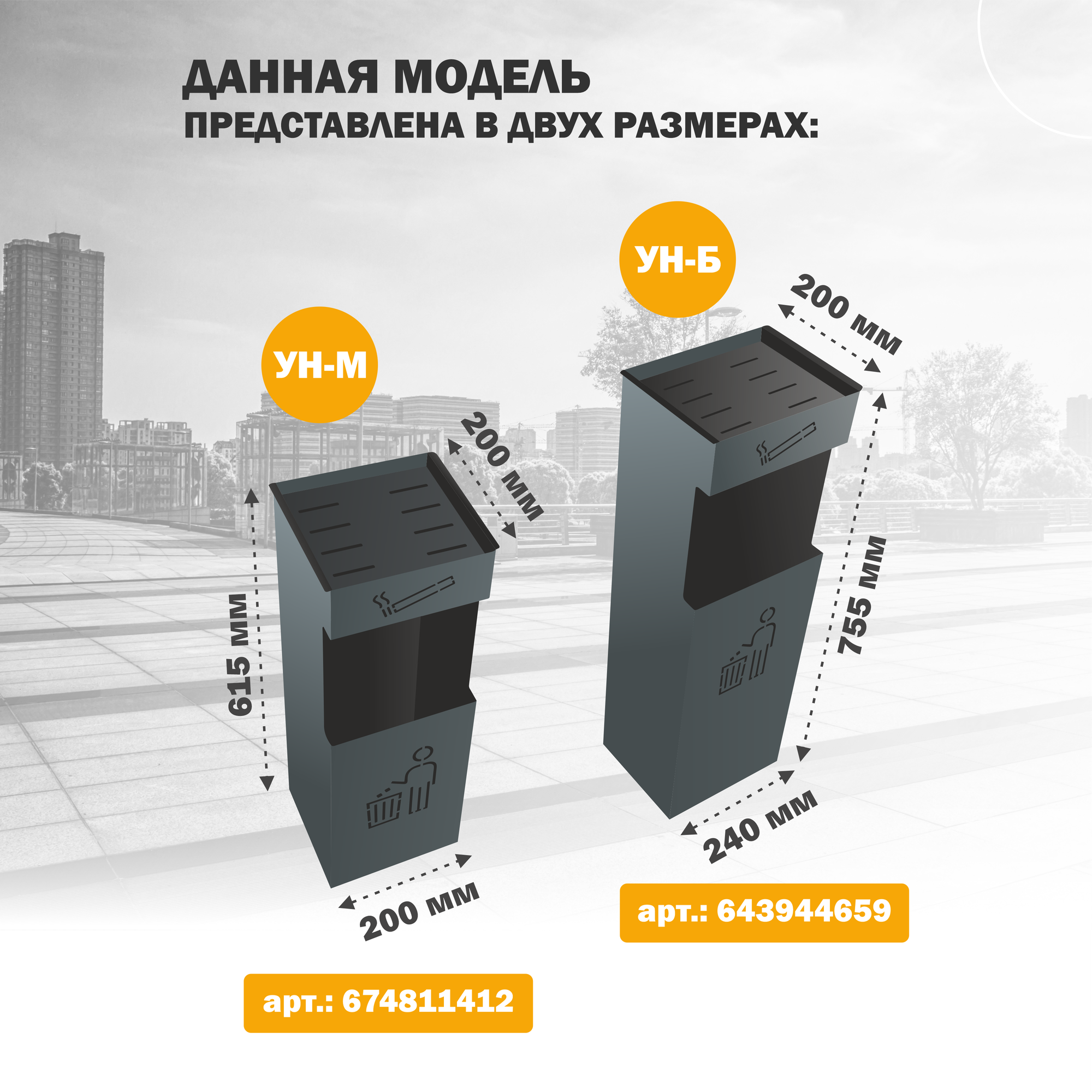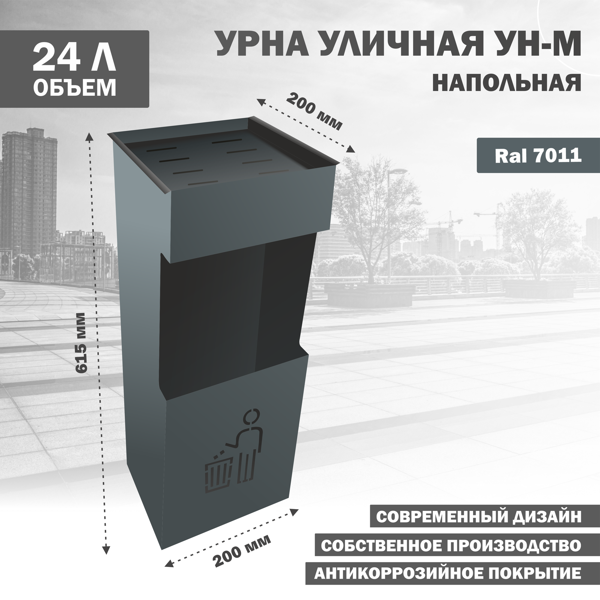 Модель УН-М выполнена в приятном сером цвете, что делает ее универсальной и лаконичной. Урна предназначена для напольной установки без крепления, что обеспечивает простоту и удобство использования.