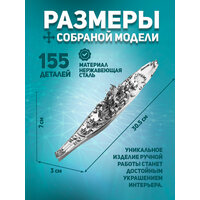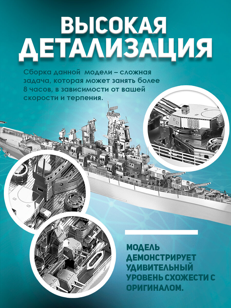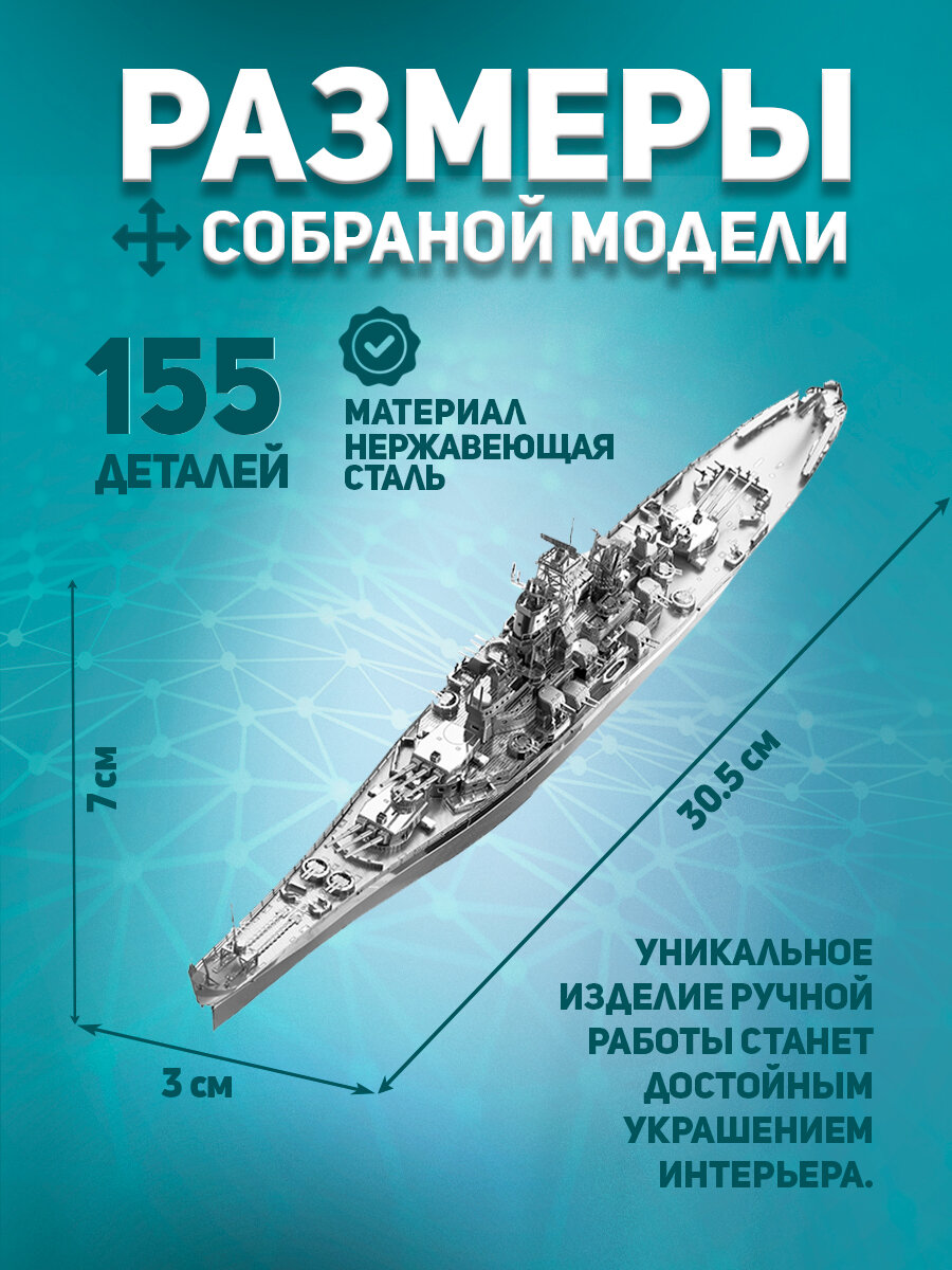 3D-конструктор из металла USS MISSOURI (BB-63)Его строительство началось на Бруклинской верфи в 1941 году. USS Missouri (BB-63) - линкор класса "Айова", третий корабль ВМС США, названный в честь американского штата Миссури. Его длина составляет 270 метров, ширина - 32,9 метра, а скорость - 33 узла. Он вступил в строй в 1944 году и получил три и пять боевых звезд во время Второй мировой и Корейской войн соответственно. "Миссури" был последним линкором, введенным в строй Соединенными Штатами, и больше всего запомнился как место капитуляции Японской империи, положившей конец Второй мировой войне.