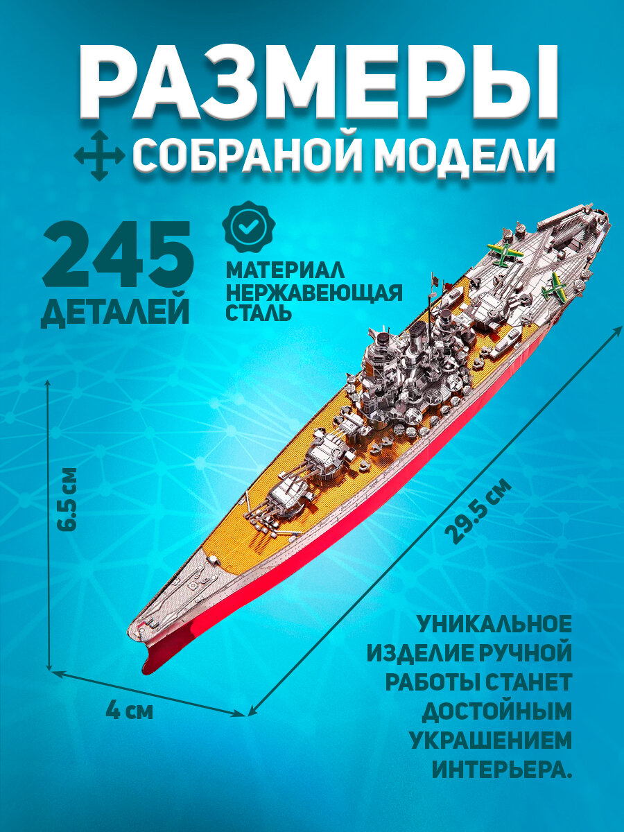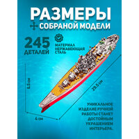 3D-конструктор из металла BATTLESHIP YAMATO - линейный корабль, построенный императорским флотом Японии во время Второй мировой войны. Это самый большой линкор в истории человечества. Когда-то он был известен как “первый в мире линкор” и “спаситель Японской империи”. Длина линкора составляет 263 метра, ширина - 38,9 метра, полное водоизмещение - 72 808 тонн, скорость - до 27 узлов. Носовая часть “Ямато” имеет сферическую форму и оснащена более чем 20 орудиями. Он оснащен толстой броней, обеспечивающей надежную защиту. Даже если в него попадут две торпеды или несколько тяжелых бомб одновременно, это не повлияет на мощь линкора.
