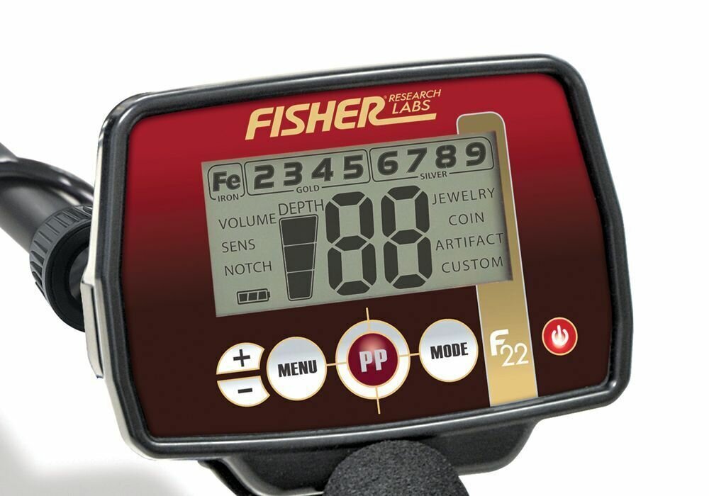 Металлоискатель Fisher F22 разработан для поиска в самых малопривлекательных погодных условиях — при повышенной влажности, поэтому прибором можно пользоваться в дождь и снег, но его нельзя погружать в воду. Идентификация обнаруженного объекта осуществляется с помощью цифрового интегрального индикатора — числа, от 1 до 99, которое отображается в центральной части экрана блока управления. Каждому найденному предмету, в зависимости от типа металла, массы и объёма, металлодетектор присваивает числовое значение, на основании которого пользователь получает информацию об обнаруженном предмете. Все числовые значения разделены на 9 сегментов и сгруппированы в 3 группы в верхней части экрана: 'Fe' — обозначает железо, это крайний левый сегмент; цифровые значения от 2 до 5 находятся в группе под общим названием 'GOLD'; цифровые значения от 6 до 9 находятся в группе под общим названием 'SILVER'. Например, монета 1 копейка 1799 года будет отображаться цифрой 88 и дублироваться в сегменте '8', монета 5 копеек 1931 года будет отображаться цифрой 48 и дублироваться в сегменте '4'. Каждому цифровому отрезку соответствует своя звуковая идентификация, всего их четыре тона, один — на железо, и три тона — на цветные металлы. Глубина залегания предмета отображается трёхступеньчатым индикатором 'DEPTH' расположенным слева от цифрового значения. В металлоискателе предустановлены четыре заводские программы поиска: 'JEWERLY' — ювелирные украшения, 'COIN' — монеты, 'ARTIFACT' — артефакты, 'CUSTOM' — пользовательская. В любой программе, с помощью функции 'NOTCH',' можно удалять из поиска или возвращать обратно любые объекты по 9-ти сегментной шкале дискриминации. Например, можно удалить или вернуть обратно объекты, которые металлоискатель располагает в группу по цифрой 9, 5, 4, 'Fe', т. е. абсолютно любую. Все настройки сохраняются в памяти прибора. Режим точного обнаружения объекта (Pin Point), обозначен центральной кнопкой 'PP', позволит найти центр обнаруженного объекта, понять какого он размера и аккуратно извлечь не повредив его. Настройка чувствительности — 10-ти уровневая, настройка громкости звукового сигнала — 20-ти уровневая. Есть индикатор состояния заряда батарей. Стандартное 1/4' гнездо для наушников. Металлоискатель оснащён эллиптической 9-дюймовой (22,86 см.) концентрической водонепроницаемой поисковой катушкой. Хорошо сбалансированный по цене-функционалу металлодетектор — доступен по цене, прост в использовании и есть полный набор необходимых при поиске функций. Будет востребован широким кругом пользователей. Режимы работы: четыре схемы дискриминации, режим идентификации объектов, режим точного обнаружения. Управление: кнопка включения/ выключения, кнопка выбора программы поиска, кнопка точного обнаружения, кнопка меню, кнопки выбора по меню. Принцип действия — VLF. Рабочая частота — 7,69 кГц. Питание — 2х1,5 В (тип АА, 2 аккумулятора в комплекте). Катушка — 9' (22,86 см.). Вес — 1,043 кг.
