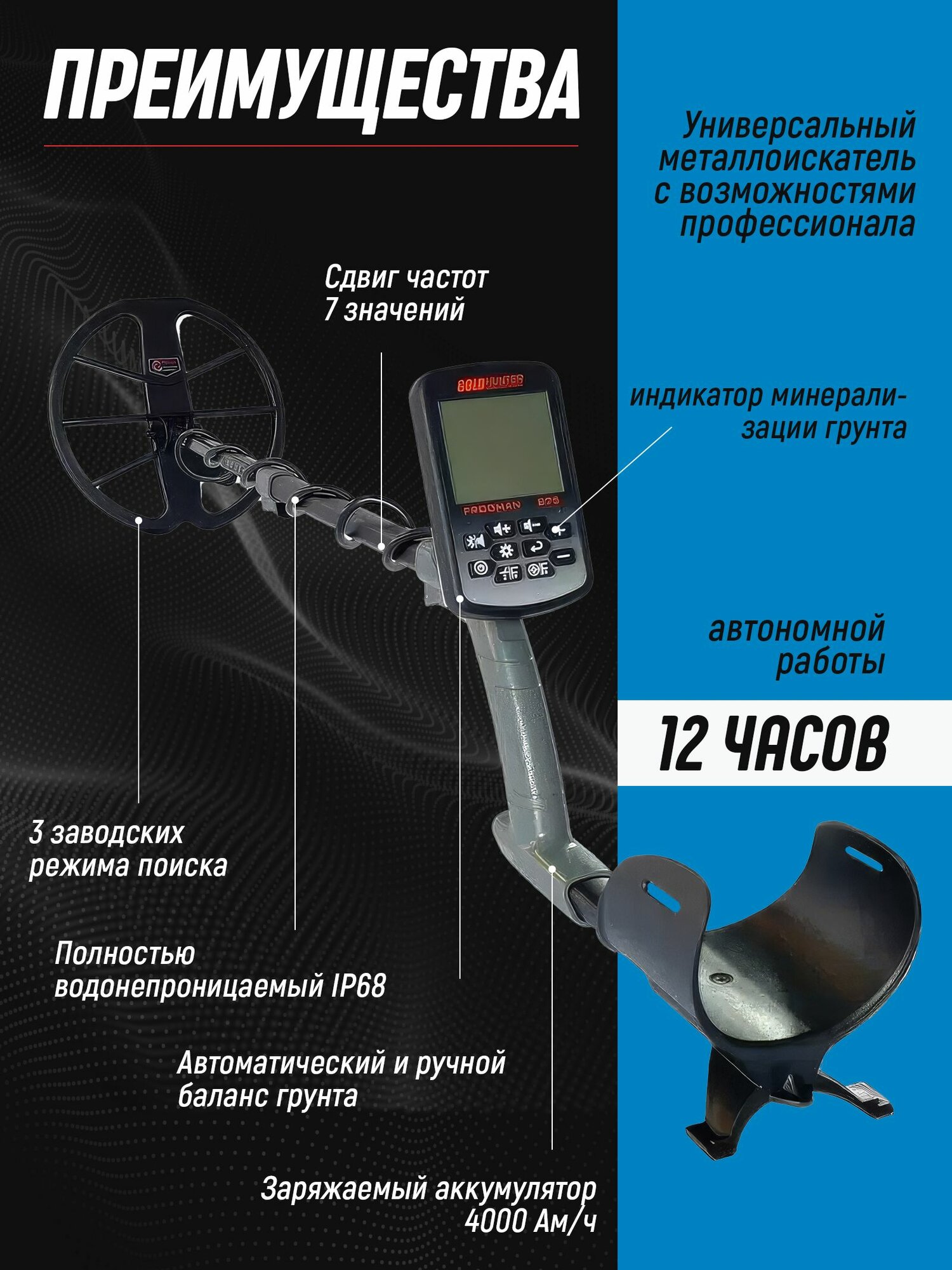 Металоискатель Frogman B75 - профессиональный инструмент для поиска драгоценных металлов, произведенный компанией Gold Hunter, которая зарекомендовала себя как надежный производитель металлоискателей.