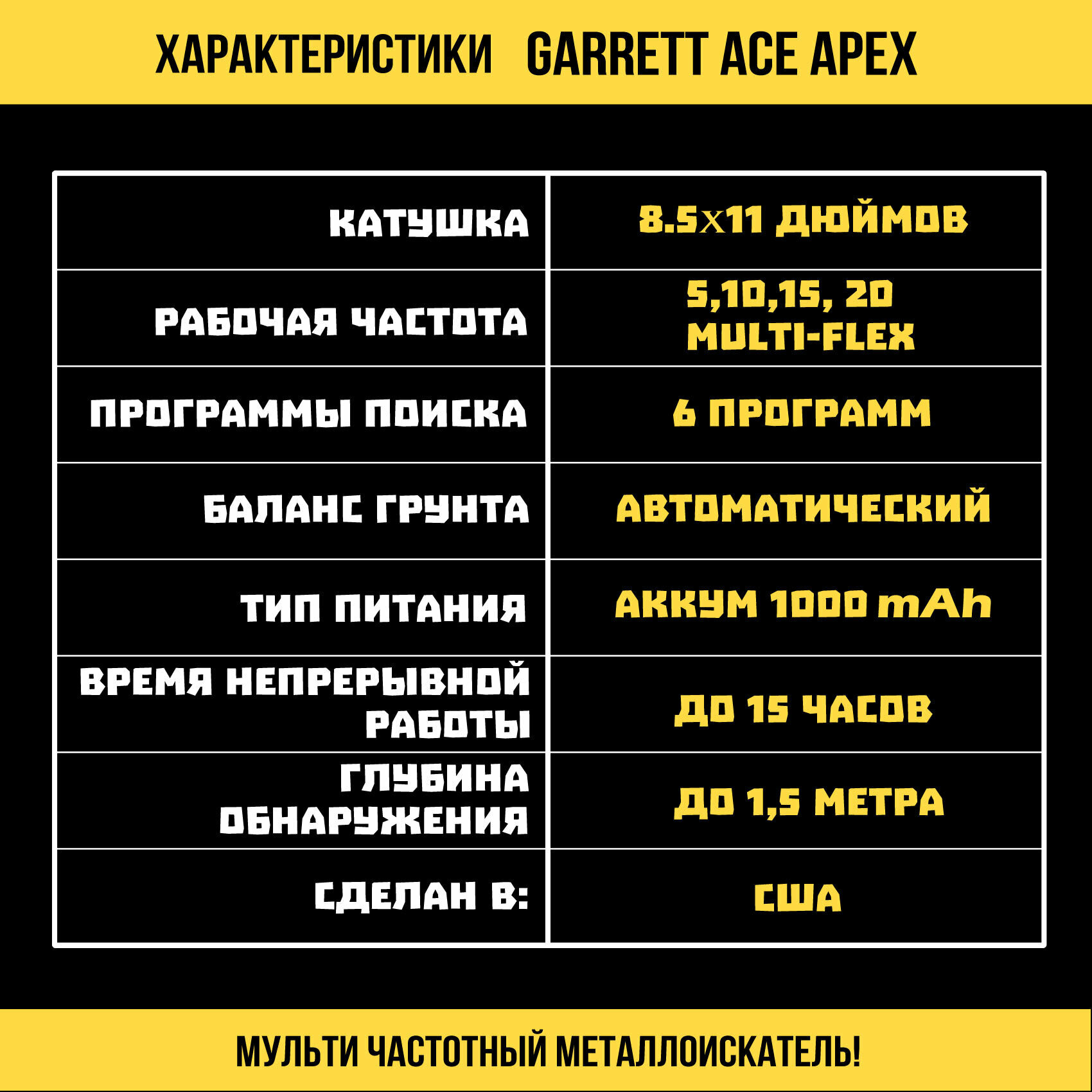 Купить Металлоискатель Garrett Ace Apex с катушкой 8,5х11′ и пинпоинтером Pro-Pointer AT / гарретт асе арех с доставкой по всей России. Металлоискатель Garrett Ace Apex с катушкой 8,5х11′ и пинпоинтером Pro-Pointer AT / гарретт асе арех: сравнение цен, характеристики, фото, актуальное наличие и цены.