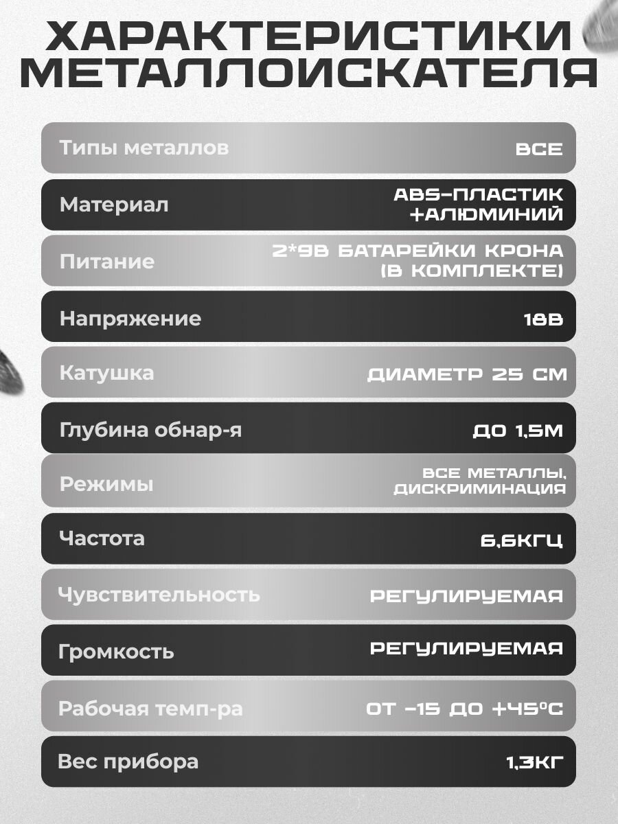 влагозащита катушки/рамки, встроенный динамик, выход на наушники, детский, дискриминатор, настройка чувствительности, подлокотник, тональная идентификация