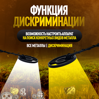 Компактный и легкий металлоискатель с регулируемой по длине ручкой. Пульт прибора оснащен регуляторами чувствительности и дискриминатора. Стрелочный индикатор служит указателем цели. Обнаружение цели сопровождается звуковым сигналом на динамик или подключенные наушники. Максимальная глубина обнаружения по стандартной монете (25 центов США) составляет 18 см. Прибор оснащен круглой поисковой катушкой диаметром 200 мм. Питается металлодетектор от двух батареек типа «Крона» (входят в комплект). Характеристики: Основной материал: металл Режимы работы: все металлические и дисковые Максимальная глубина > 180 мм для U.S четверти во всех металлических режимах Обнаружение предметов: металл (железный гвоздь, покрытие из железа, алюминиевая петля, маленький алюминиевый продукт, монеты, золото, бронза, серебро) Рабочая частота: 5,69 кГц Источник питания: 2 шт. x 9 В батарея (не входит в комплект) Рабочий ток: в режиме ожидания 10 мА, макс. 70 мА Индикация обнаружения: механический режим указателя, Аудио режим Чувствительность: регулируемая Регулируемый стержень: максимальная длина: около 1080 мм/42,5 дюйма, минимальная длина: 780 мм/30,7 дюйма Диаметр поисковой катушки: около 200 мм/7,9 дюйма Динамик или разъем для наушников: 1,2"