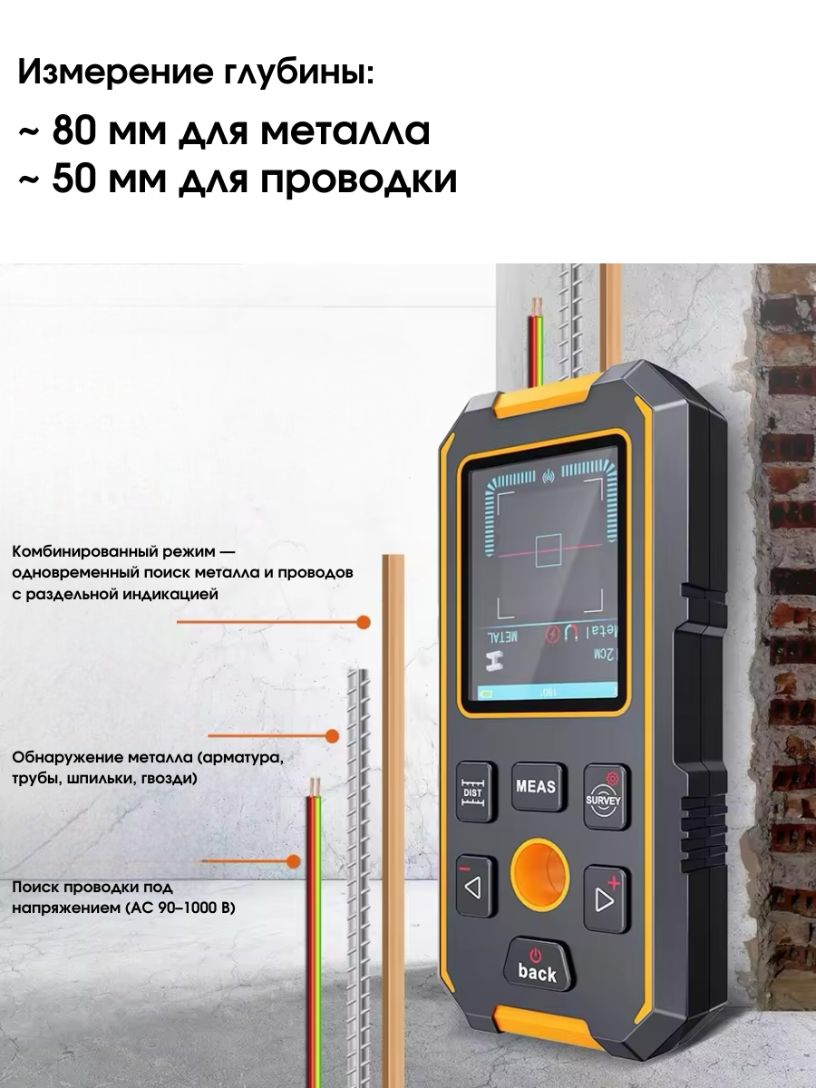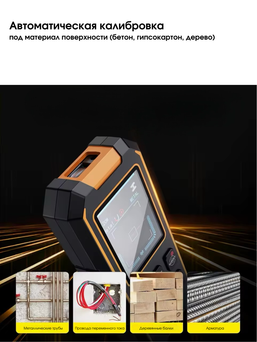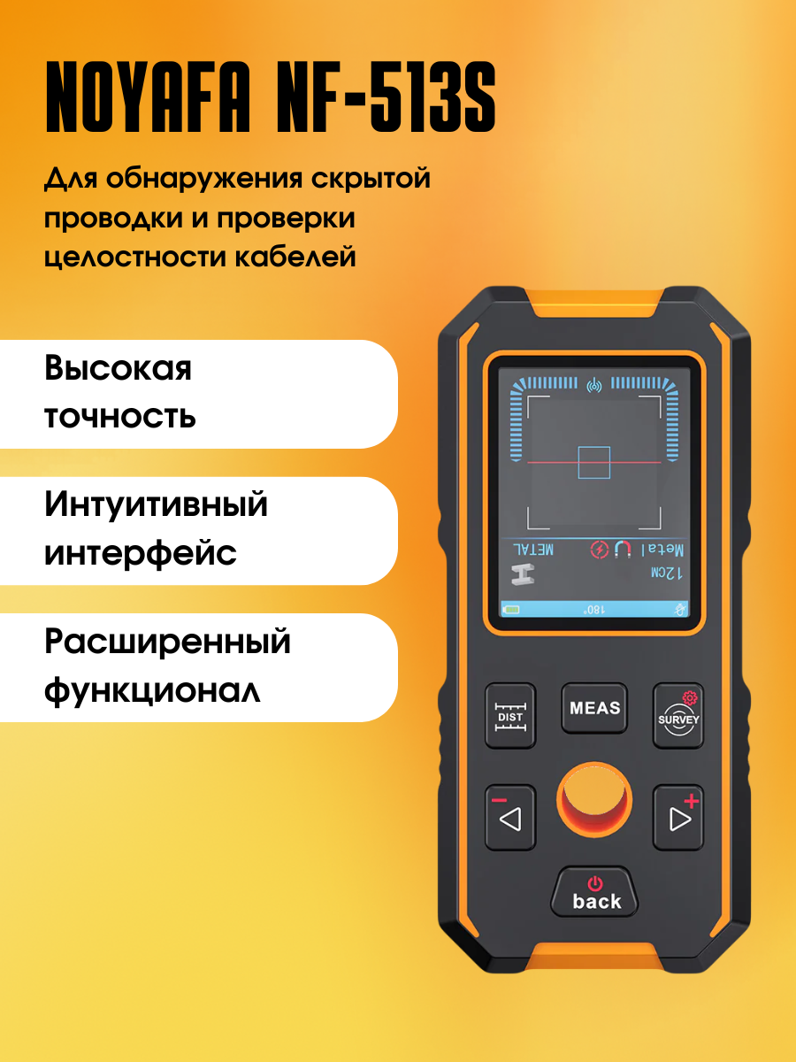 Особенности и преимущества Три режима обнаружения, быстрое измерение, точное позиционирование – высокочувствительные датчики обнаруживают металл, дерево и электрические провода на глубине до 100 мм, обеспечивая безопасное и точное сверление. Большой цифровой дисплей и голосовое оповещение – 2,4-дюймовый HD-экран остается хорошо читаемым как при ярком солнечном свете, так и в темноте без бликов. Функция голосового оповещения в реальном времени устраняет необходимость постоянно следить за экраном. Прочный, водонепроницаемый и пылезащищенный корпус – ударопрочная конструкция с покрытием Soft Rubber и степень защиты IP54 делают устройство устойчивым к внешним воздействиям. Легкий и компактный дизайн позволяет использовать прибор в сложных условиях и различных сценариях. Расширенные функции версии NF-513S – лазерное измерение расстояния с точностью ±1 мм, поддержка нескольких режимов измерения (одиночное, площадь, объем и др.), а также импортные оптические линзы с низким энергопотреблением. Встроенный аккумулятор и хранение данных – порт Type-C для зарядки позволяет экономить на батарейках. NF-513S поддерживает хранение до 50 наборов данных, упрощая запись и последующий доступ к измерениям.