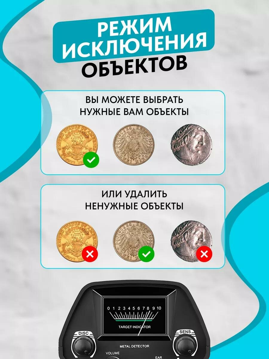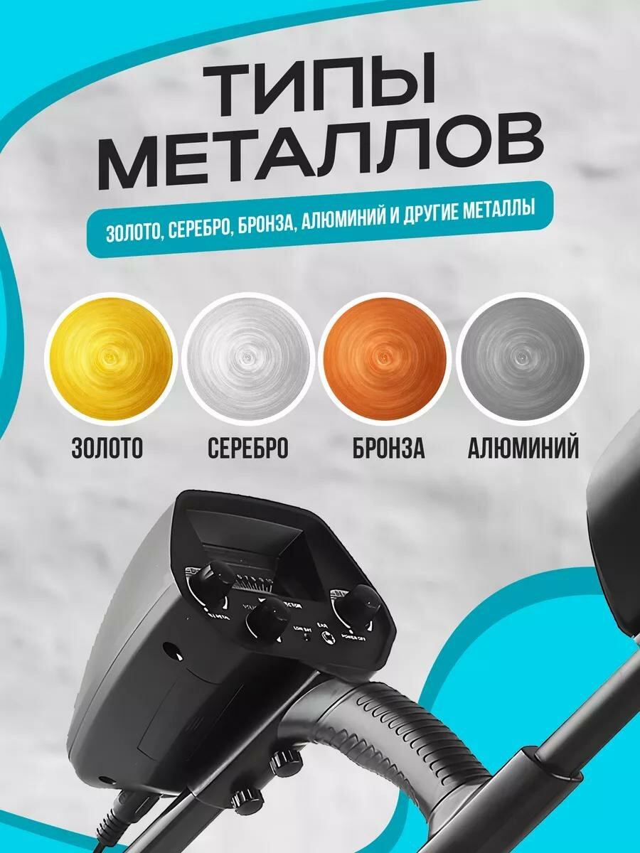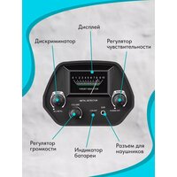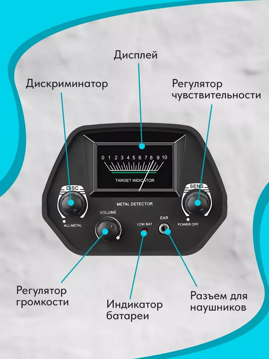 Металлоискатель оснащён дискриминатором, регуляторами громкости и чувствительности, индикатором уровня заряда и разъёмом для наушников — всё, чтобы вы могли сосредоточиться на поиске даже в шумной обстановке.