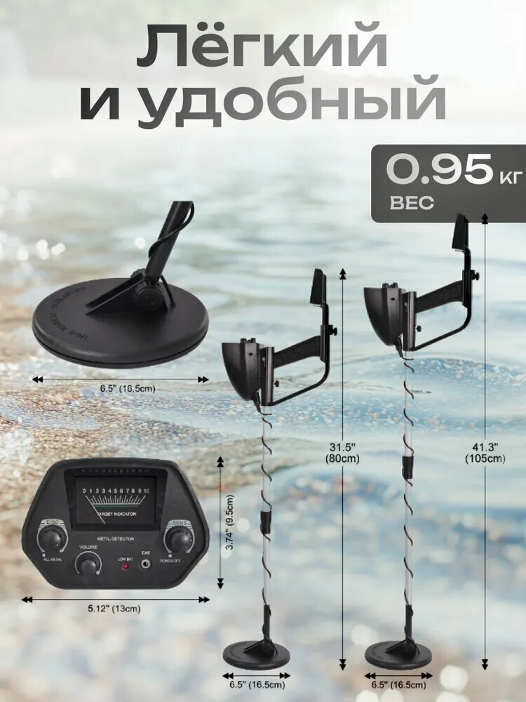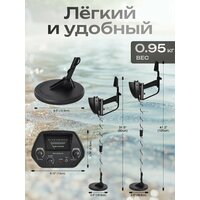 | Подробная комплектация | Металлоискатель, Поисковая катушка, Нижняя и верхняя штанга с подлокотником, Инструкция, 2 батарейки типа Крона |