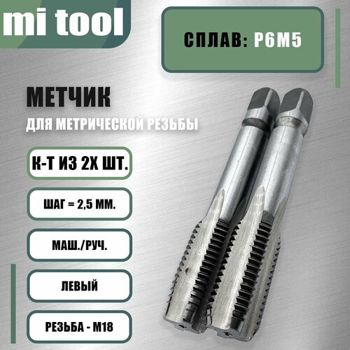 Метчик М 18х2,5 м/р к-т из 2-х шт. левый - это комплект из двух метчиков с левой резьбой, предназначенных для нарезания внутренней метрической резьбы с диаметром 18 мм и шагом 2,5 мм.