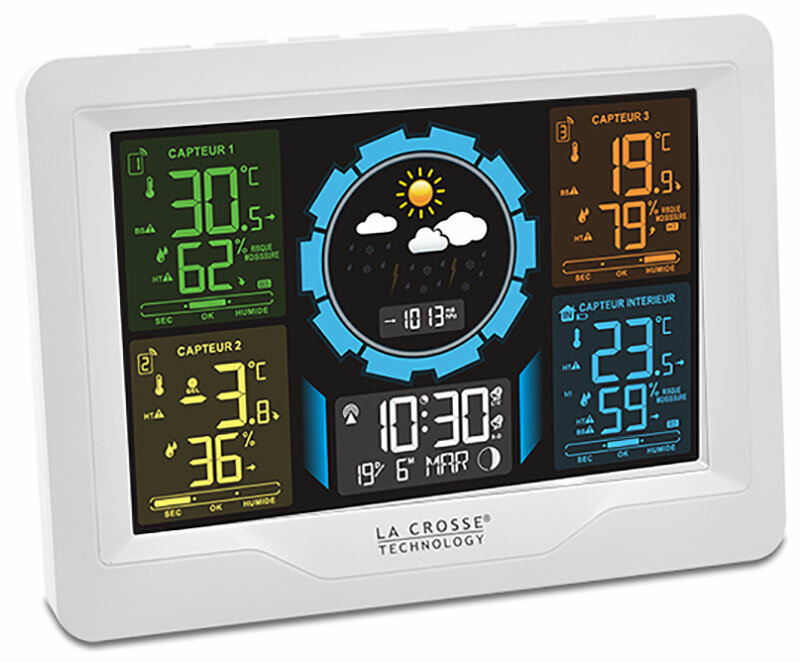 Помимо информации с термогигродатчиков, погодная станция La Crosse WS6304 покажет атмосферное давление и прогноз погоды на 12-24 часа. У нее есть календарь, время (может синхронизироваться по атомным часам), два будильника, индикация заморозков и условий появления плесени, фазы Луны, тенденции изменения параметров.