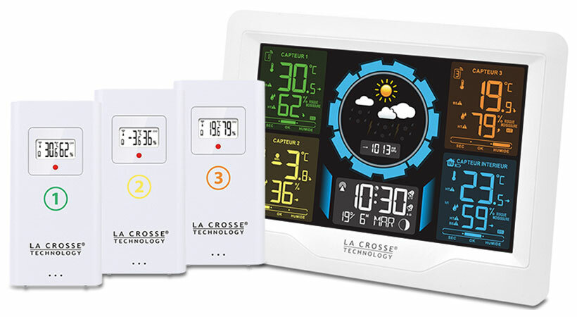 На ярком дисплее в удобном для восприятия формате выводится информация от трех независимых датчиков (датчики с собственным дисплеем идут в комплекте) и встроенного в базу сенсора. У большинстве похожих моделей подобный функционал сильно ограничивает остальные возможности станции, но инженеры La Crosse Technology смогли сделать настоящий универсальный комплекс