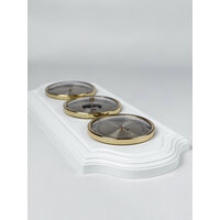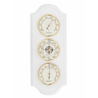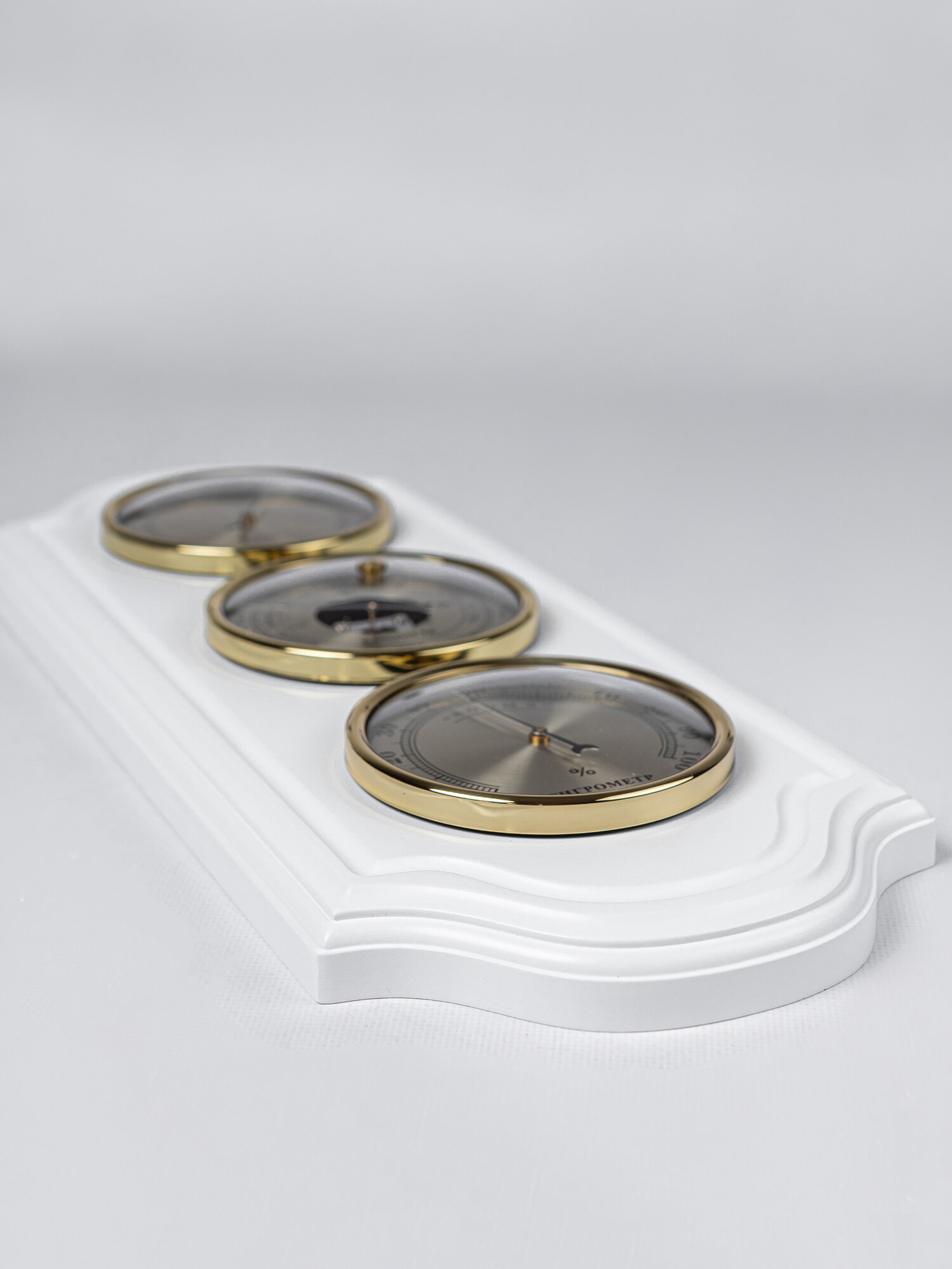 Настенную метеостанцию можно разместить в гостиной, холле или рабочем кабинете. Основа станции выполнена из массива дерева и покрыта лаком. Силуэт имеет прямоугольную форму, а каждый прибор выделен изгибами основания и обведен золотистой оправой. Высота метеостанции составляет 39 см, показания приборов хорошо читаются на расстоянии. В метеостанцию установлены: барометр, гигрометр, термометр. Барометр-анероид — прибор, измеряющий атмосферное давление. С его помощью составляют метеопрогнозы. Погоду определяют по алгоритму: - смотрят на показания прибора и фиксируют значение при помощи дополнительной стрелки; - через час проверяют, в какую сторону изменятся показания. Если давление понизится, то начнется дождь. Если повысится, то будет солнечно. Кроме делений на шкалу нанесены зоны, описывающие погоду: буря, дождь, переменная облачность, солнечно, сухо. Чтобы разобраться в показаниях такого прибора вам не нужно быть специалистом. Одного взгляда достаточно, чтобы понять предстоящие изменения погоды. Гигрометр прибор, измеряющий влажность воздуха. Помогает вместе с термометром поддерживать нормальный микроклимат в помещении. Отклонения от 45% влажности негативно отражаются на самочувствии человека. Термометр определяет температуру воздуха. В настенной метеостанции применен термометр со спиртовой колбой, она дает точные показание и безопасна в использовании.