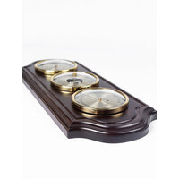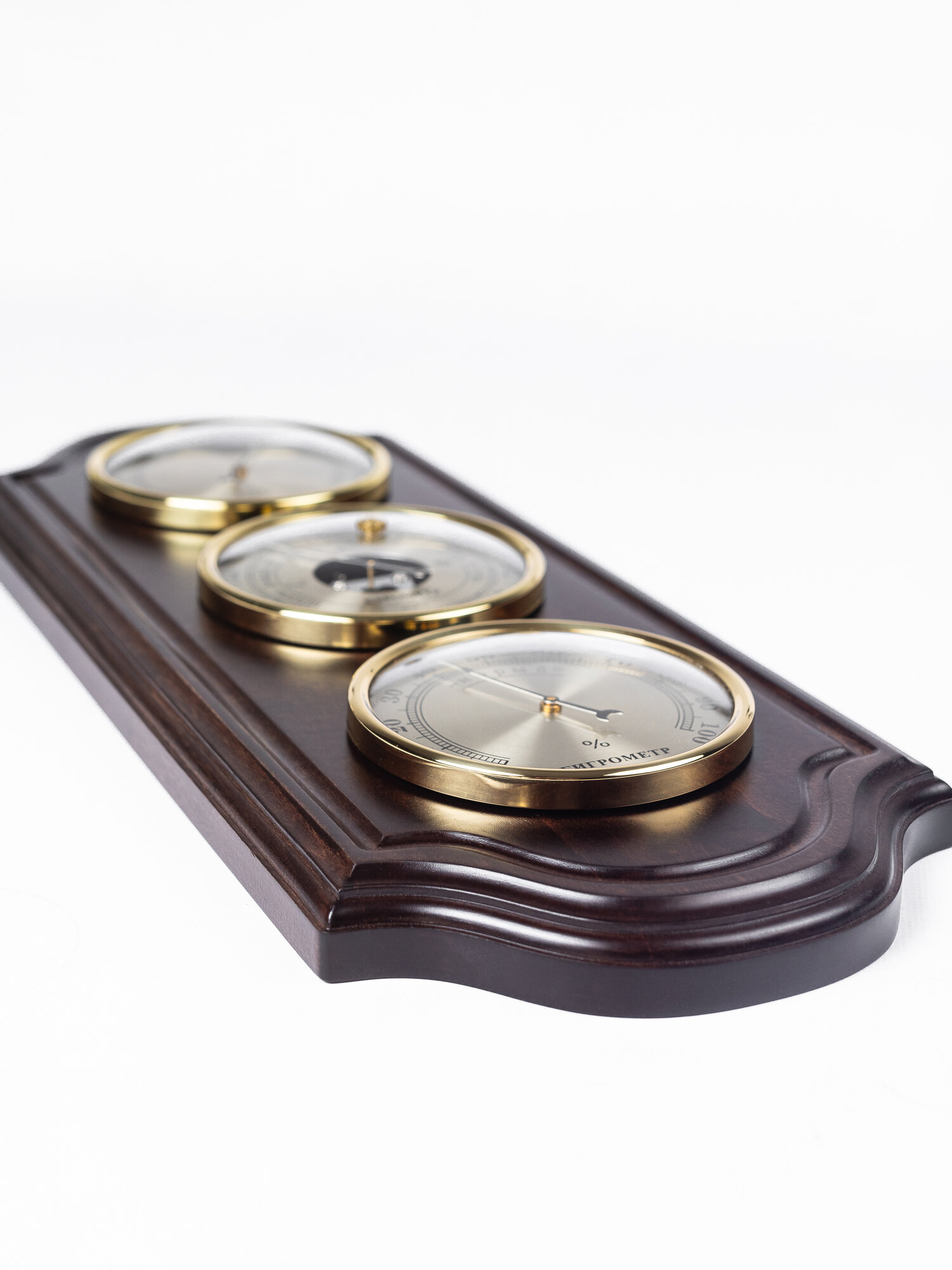 Настенную метеостанцию можно разместить в гостиной, холле или рабочем кабинете. Основа станции выполнена из массива натурального дерева и покрыта лаком. Силуэт имеет прямоугольную форму, а каждый прибор выделен изгибами основания и обведен золотистой оправой. Высота метеостанции составляет 39 см, показания приборов диаметром 90 мм хорошо читаются на расстоянии.