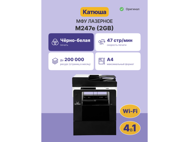 Мфу катюша M247e (2GB) мфу катюша M247e принтер/копир/сканер/факс. 47 стр/мин а4+ ч/б печать, 1200 dpi. сканер цвет а4-а3 до 60 стр/мин. CPU 1 ггц, 2 гб RAM, Ethernet, USB, USB-host, Wi-Fi. PS3, PCL, PDF, GDI. DF 50 листов. 6″ панель управления + клавиату: сравнение цен, характеристики, фото, актуальное наличие и цены.