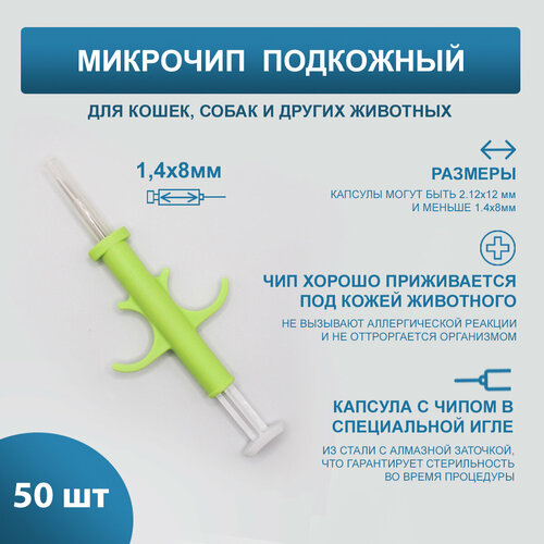 Микрочип в шприце 50шт, 8 стикеров со штрихкодами и номером метки для вклейки в бумажные документы.