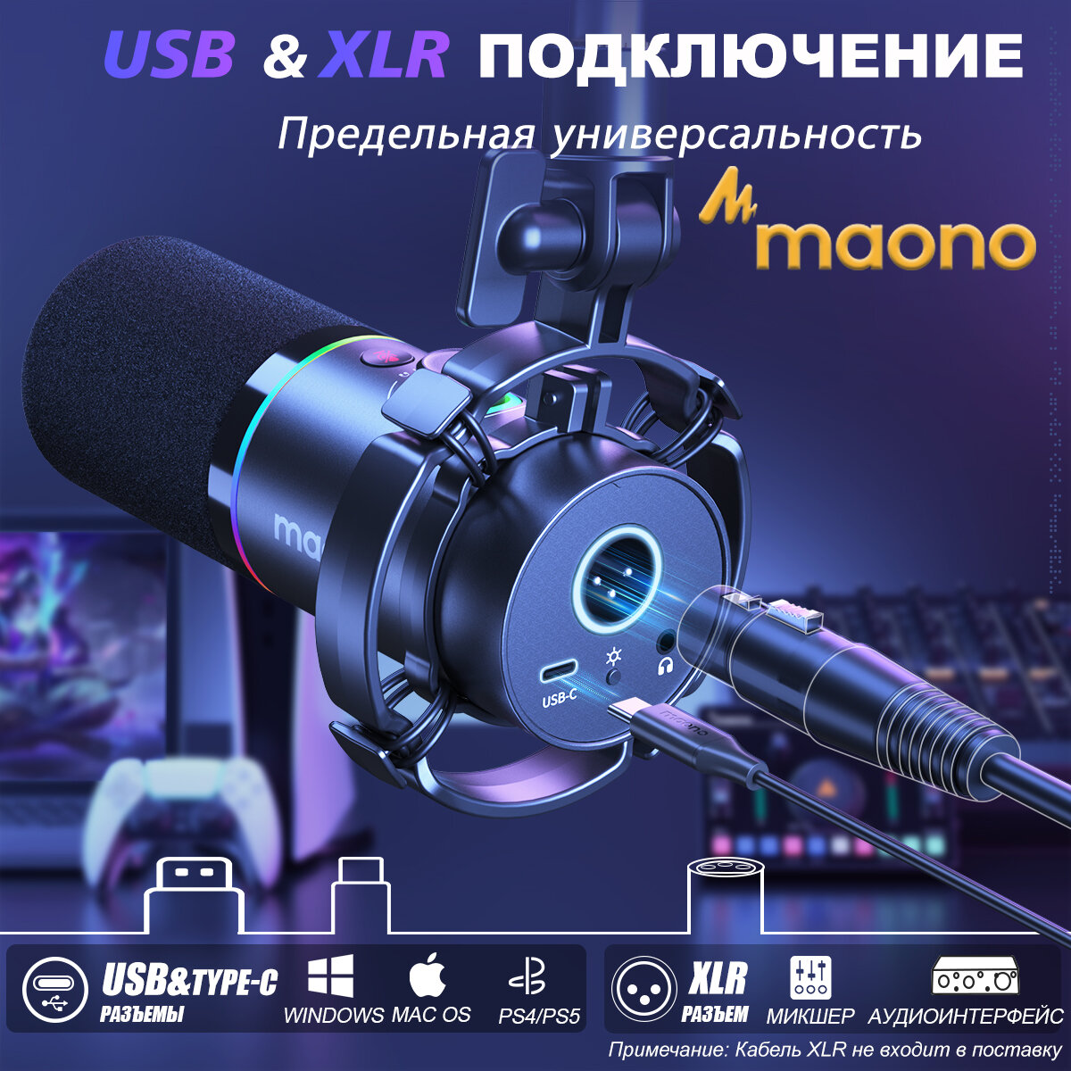 Стационарный проводной микрофон для ПК не требует внешней аудиокарты, работает с телефонами Android и IOS, компьютерами и ноутбуками под Mac и Windows, Sony Playstation. По XLR можно подключать к микшеру и аудиоинтерфейсу. Он отлично подходит для озвучивания, потокового вещания, видео на YouTube и онлайн-конференций, а также гейминга и подкастинга.