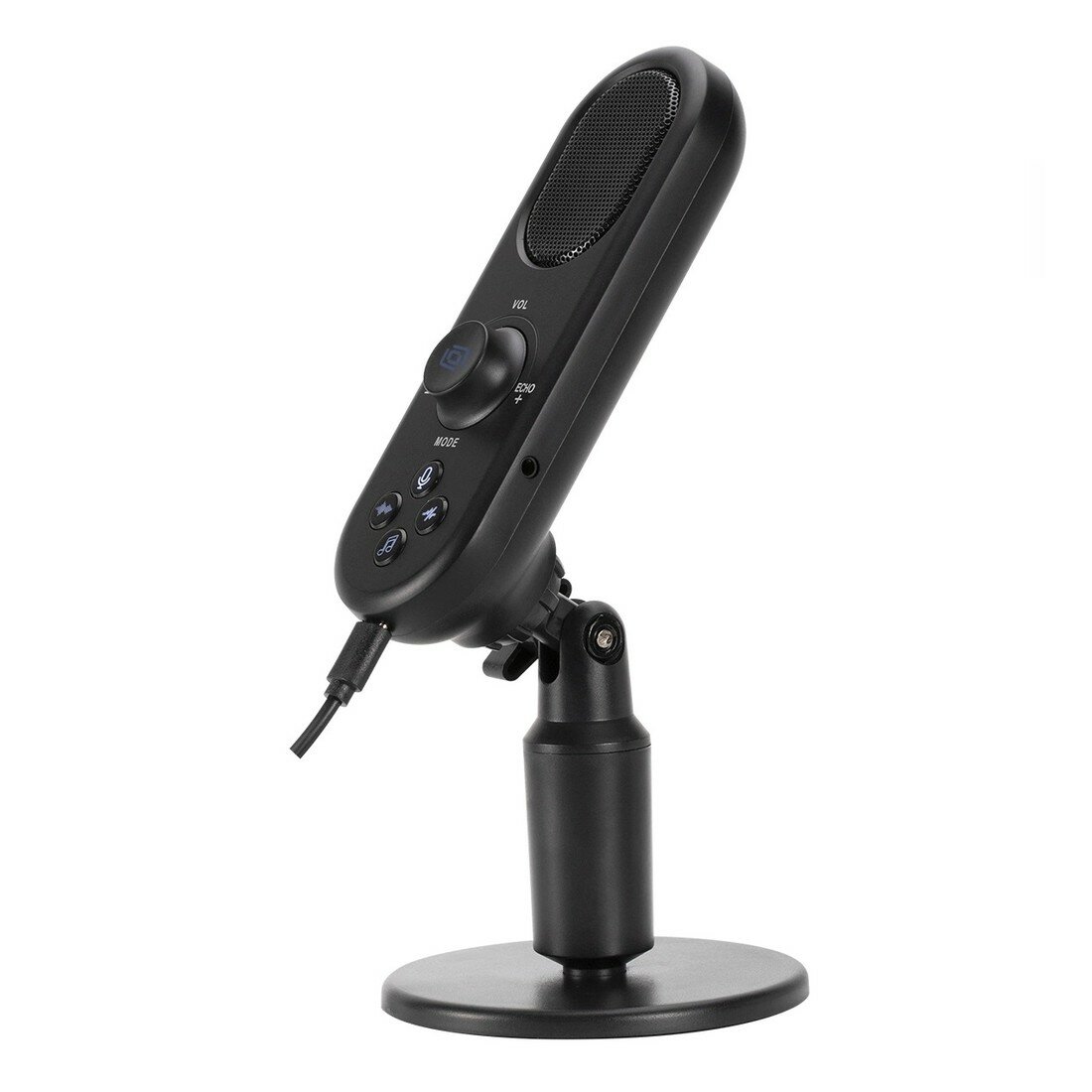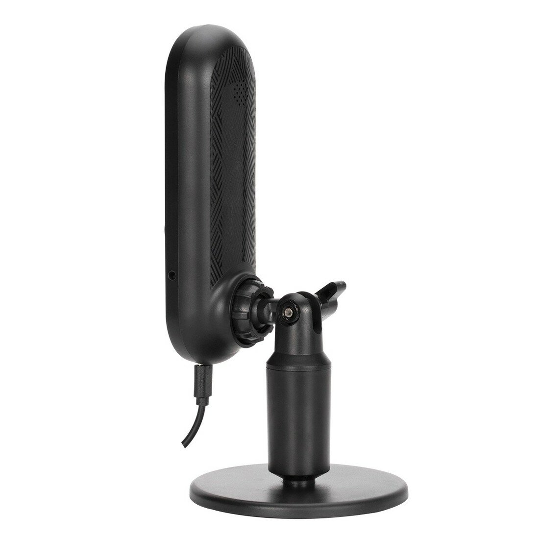 Микрофон оснащен устойчивым основанием и возможностью регулировки угла наклона, что позволяет настроить оптимальное положение микрофона для комфортного использования.