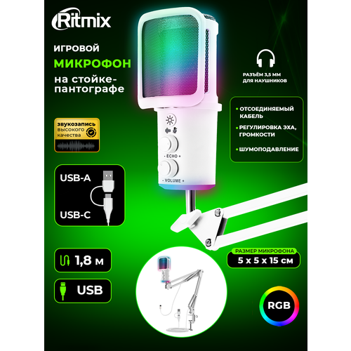 Микрофон RITMIX RDM-278 USB Gaming White- это конденсаторный микрофон, предназначенный для использования с компьютерами. Он оснащен RGB-подсветкой и шумоподавлением, что делает его отличным выбором для геймеров и тех, кто проводит много времени за компьютером.