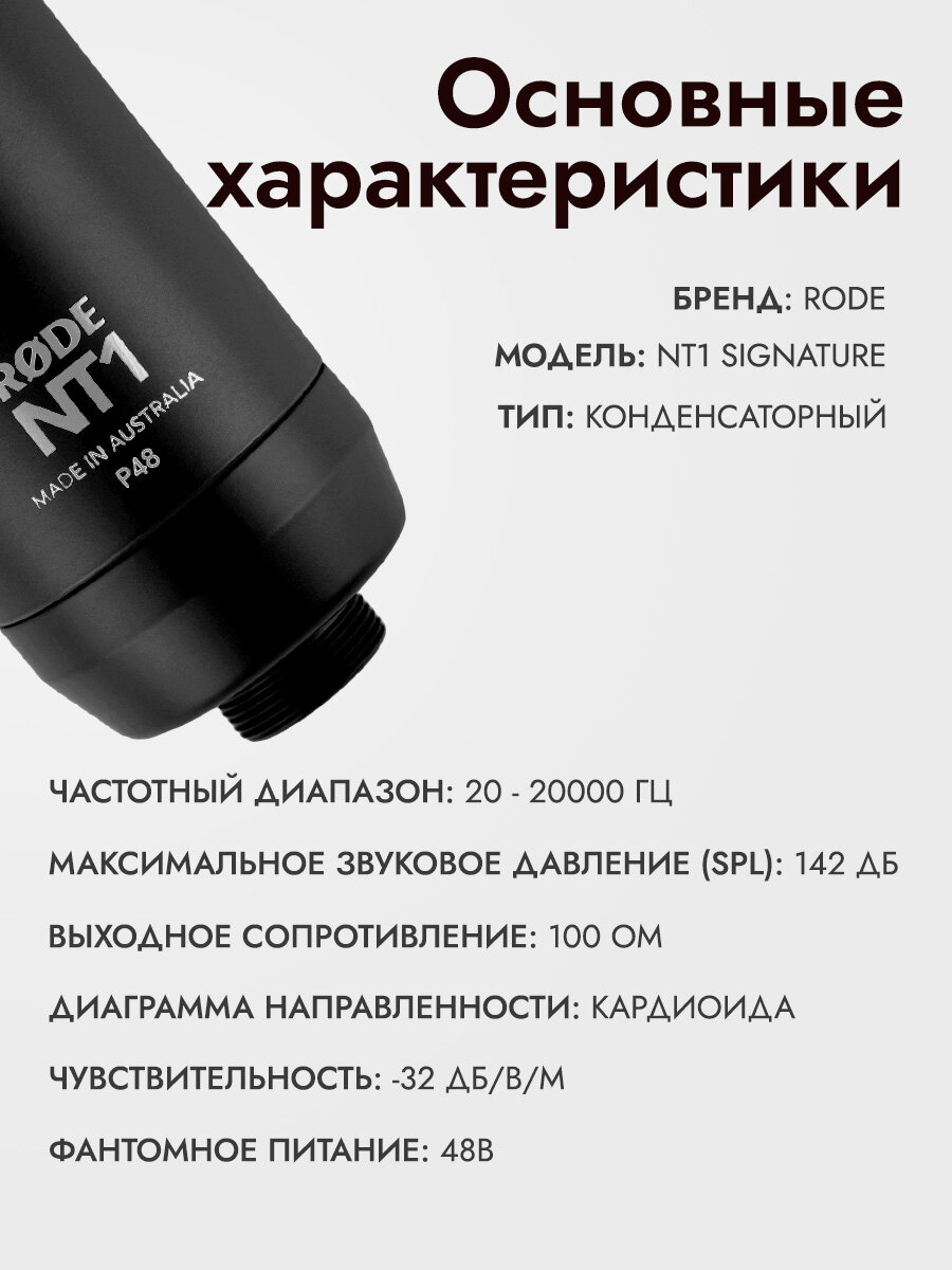 RODE NT1 Signature Red – это студийный микрофон, относящийся к категории конденсаторных устройств. Данная модель практически по всем своим характеристикам идентичная модели NT1 Gen 5. Есть только одно отличие – коммутационный разъем. NT1 Signature подключается только через трехконтактный XLR. Важным преимуществом микрофона является широкая палитра цветов: модель доступна к покупке в шести разных расцветках. В основу NT1 Signature Red заложен конденсаторный капсюль HF6 с кардиоидной полярностью (его диаметр равен одному дюйму). За счет этого звук улавливается прямо перед микрофоном, а внешние шумы с боков и сзади отсекаются. Амплитудно-частотная характеристика составляет 20-20000 Гц. При этом верхние частоты в звучании более яркие, средние – более отчетливые, а нижние – более насыщенные. Следовательно, микрофон может использоваться для записи не только вокала, но и разнообразных инструментов (клавиш, гитар, ударных и пр.). Модель NT1 Signature Red имеет низкий уровень собственного шума (4 дБА) и, наоборот, высокий показатель звукового давления (до 142 дБ). Это позволяет ей эффективно улавливать любые звуки, включая тихий шепот и еле различимые отзвуки инструментов. Сопротивление на выходе равно 100 Ом, а чувствительность составляет -32 дБ. Что касается материалов, то корпус студийного микрофона NT1 Signature Red сделан из прочного алюминия, что делает его одновременно легким и удобным, а также устойчивым к любого рода повреждениям. Микрофон комплектуется надежным антивибрационным подвесом типа «паук», встраиваемым в него поп-фильтром и коммутационным кабелем XLR премиум класса. Все аксессуары окрашены в черный цвет, а сам микрофон – в красный. Также модель можно приобрести в черном, синем, зеленом, фиолетовом и розовом тонах.