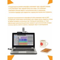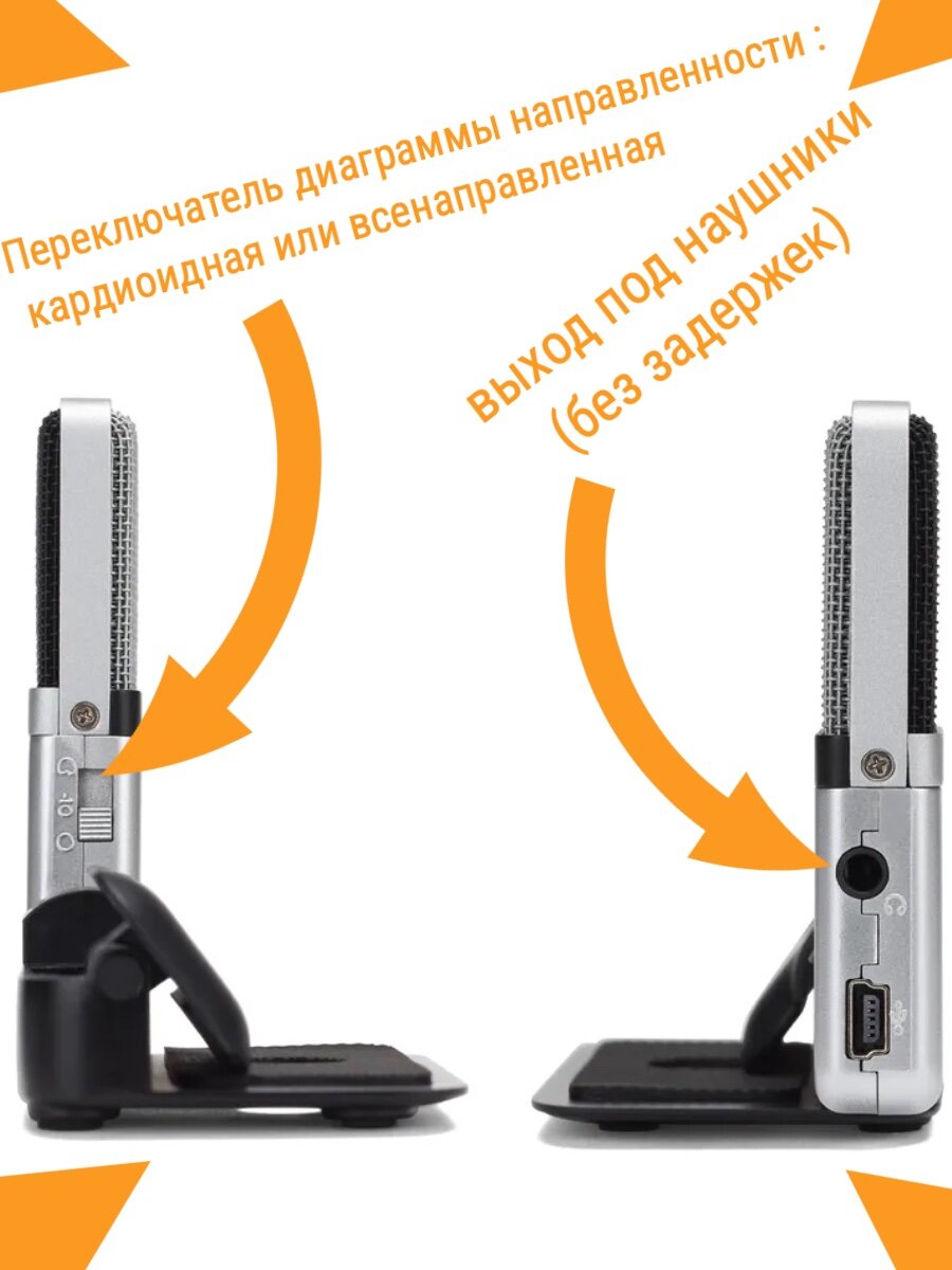 встроенный усилитель для наушников с регулятором уровня сигнала для прослушивания входящего сигнала и микса прямо с микрофона, режим прямого мониторинга с нулевой задержкой с программным управлением, высококачественный 16-битный аналогово-цифровой преобразователь, частота семплирования 48 кГц, 3/8" монтажное отверстие, поворотный механизм на 360°