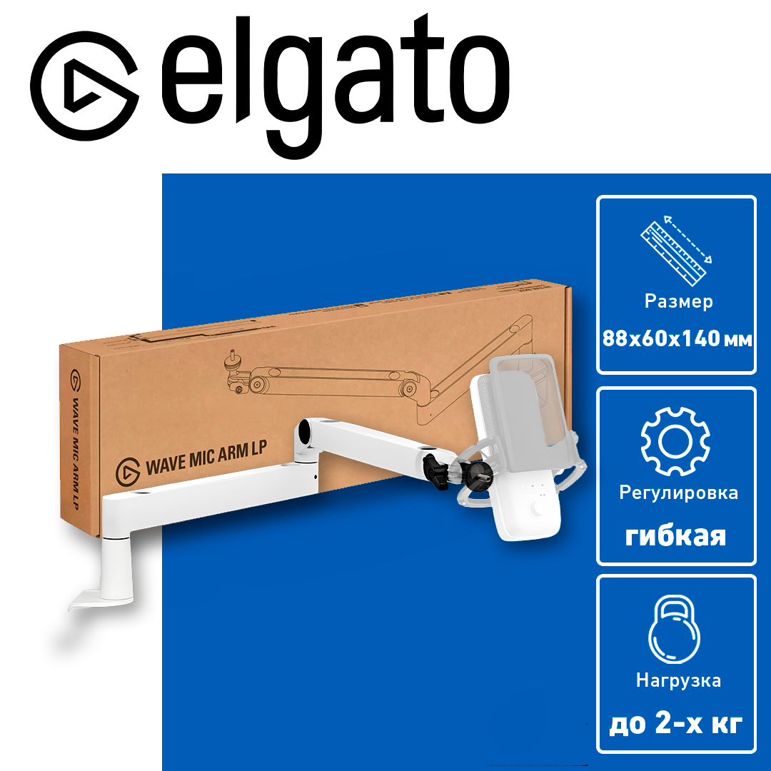 ВРАЩЕНИЕ НА 360°(максимальная маневренность); ИНТЕГРИРОВАННЫЕ КАБЕЛЬ-КАНАЛЫ (крышка на магнитах, которая легко снимается и ставится на место ). В комплексте: Микрофонная стойка Elgato Wave Mic Arm LP ;Адаптеры 1/4 "- 3/8" и 1/4 "- 5/8"; Шестигранный ключ; Краткое руководство пользователя
